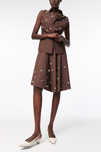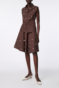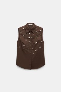 The sleeveless shirt is cut in cotton-poplin and features pearl and crystal hand embellishment on the front. Pair with the swing skirt or midi-skirt to complete the set. Material & Care - 96 % Cotton, 4 % Elastane - Hand-embellished sleeveless shirt in cotton-poplin - Classic collar - Hidden placket - Double layer front Size & Fit - Fitted shoulders - Form-fitting