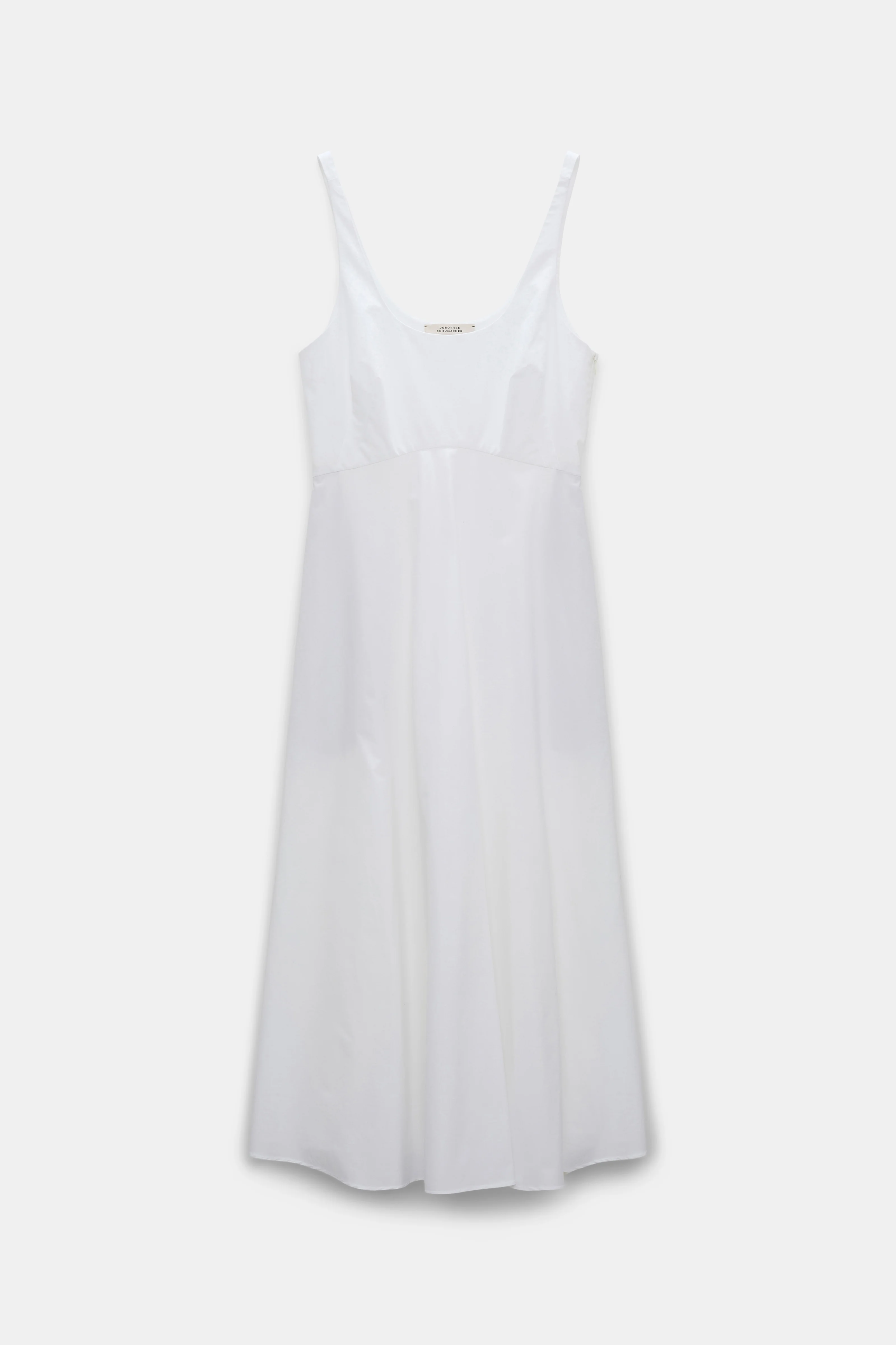 The cotton poplin midi-dress features a ballerina neckline and emprie waist, which comes to a V at the back. The dress is fitted at the top and falls into a bias cut swing skirt. Pair with the cropped blouse for a layered look. Material & Care - 96 % Cotton, 4 % Elastane - Cotton poplin midi-dress with ballerina neckline - Emprie waist tapers to a V at the back - Bias cut skirt - In-seam side pockets - WE CARE - This item is finished according to STANDARD 100 by OEKO-TEX, 22.0.98928 Hohenstein HTTI - Hand wash program / Machine wash - Wash with similar colors Size & Fit - Our model is 180cm tall and wears a size 2 - Form-fitting bodice - Swing skirt