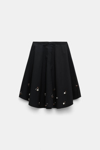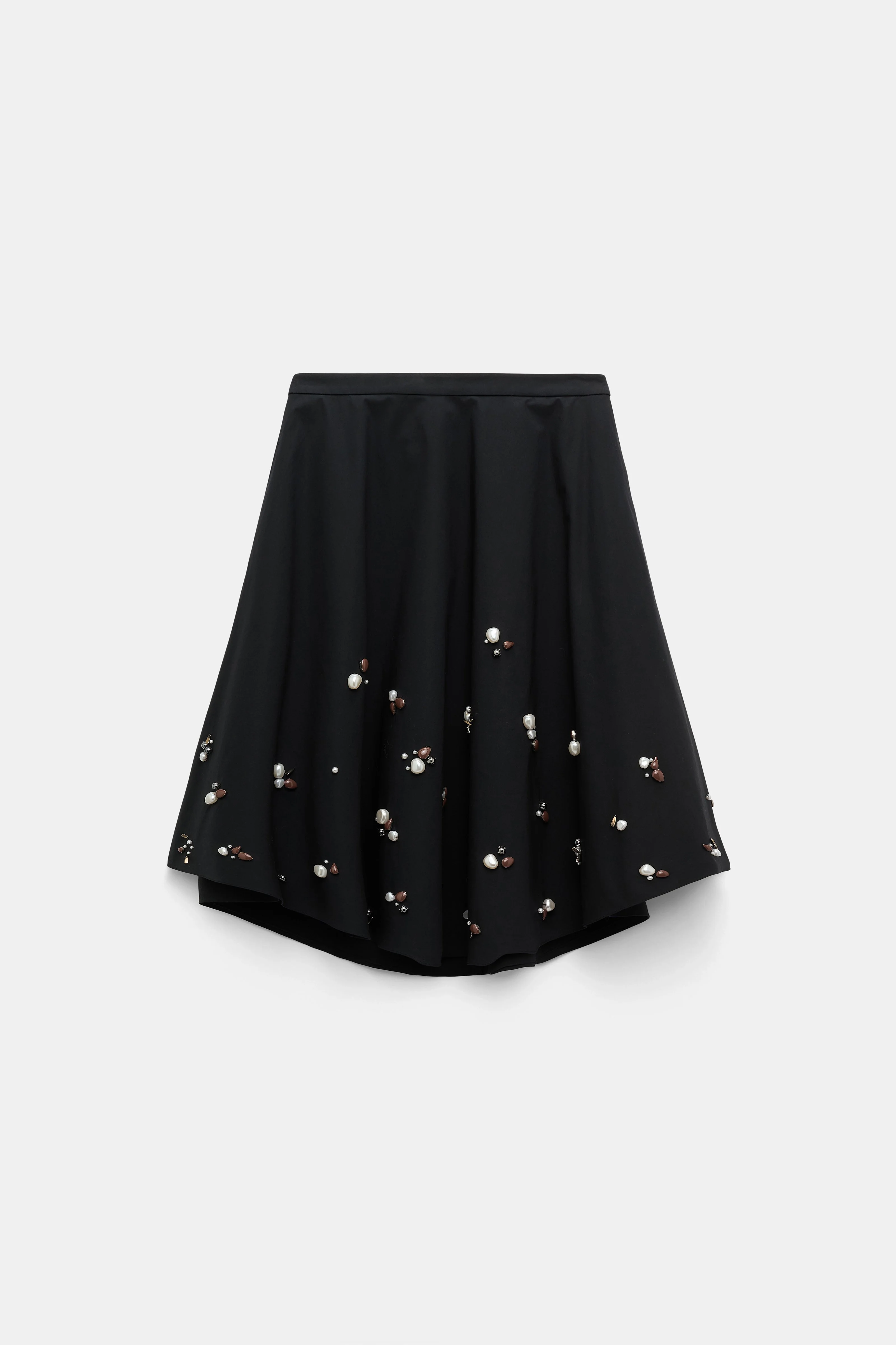 Unapologetically feminine, the cotton-poplin swing skirt is cut with a swishy, full silhouette and features pearl and crystal hand embellishment at the hem. The matching top completes the set. Material & Care - 96 % Cotton, 4 % Elastane - Hand-embellished swing skirt in cotton-poplin - Double layered - Hidden back zip closure Size & Fit - Fitted waist - Wide hem