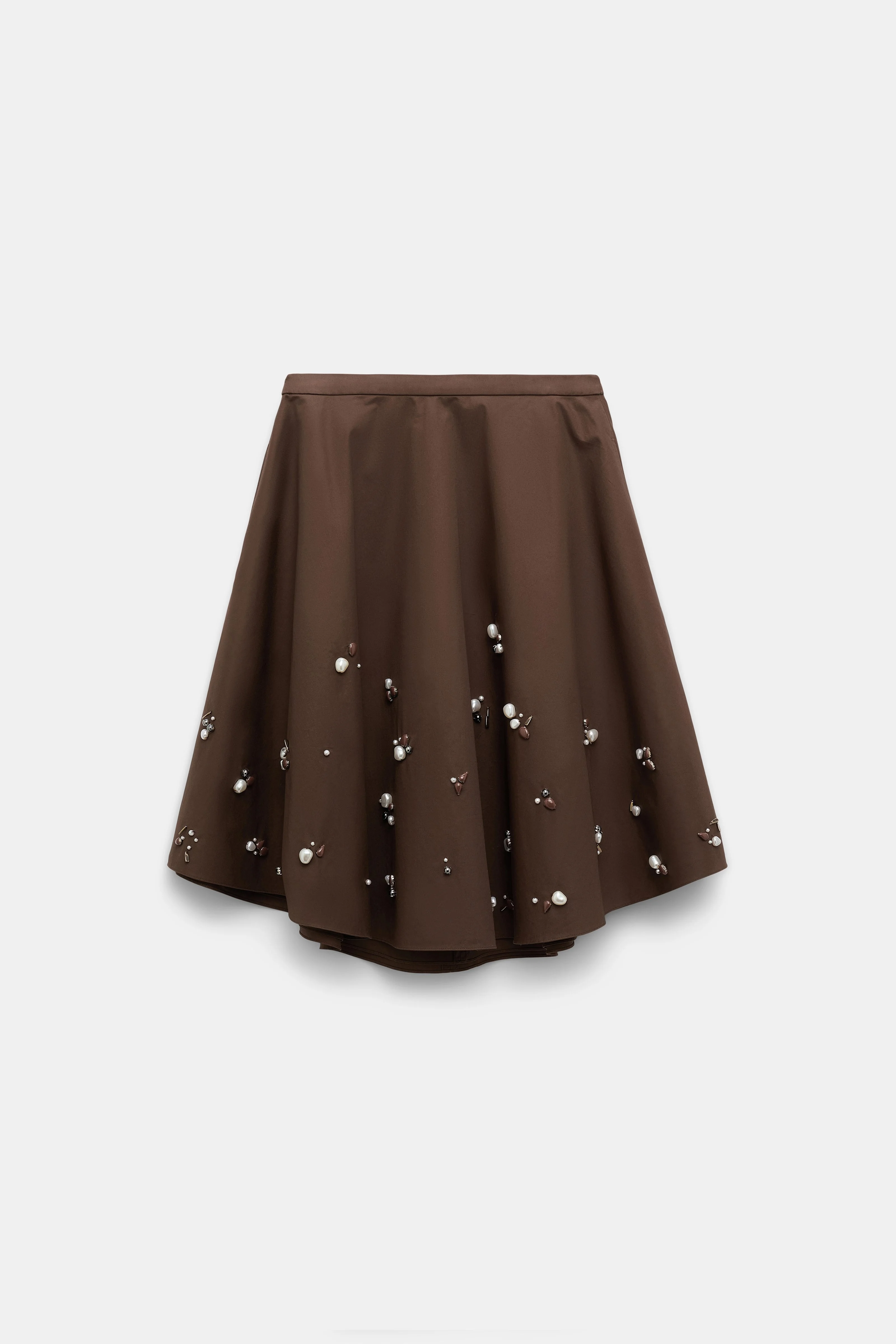 Unapologetically feminine, the cotton-poplin swing skirt is cut with a swishy, full silhouette and features pearl and crystal hand embellishment at the hem. The matching top completes the set. Material & Care - 96 % Cotton, 4 % Elastane - Hand-embellished swing skirt in cotton-poplin - Double layered - Hidden back zip closure Size & Fit - Fitted waist - Wide hem