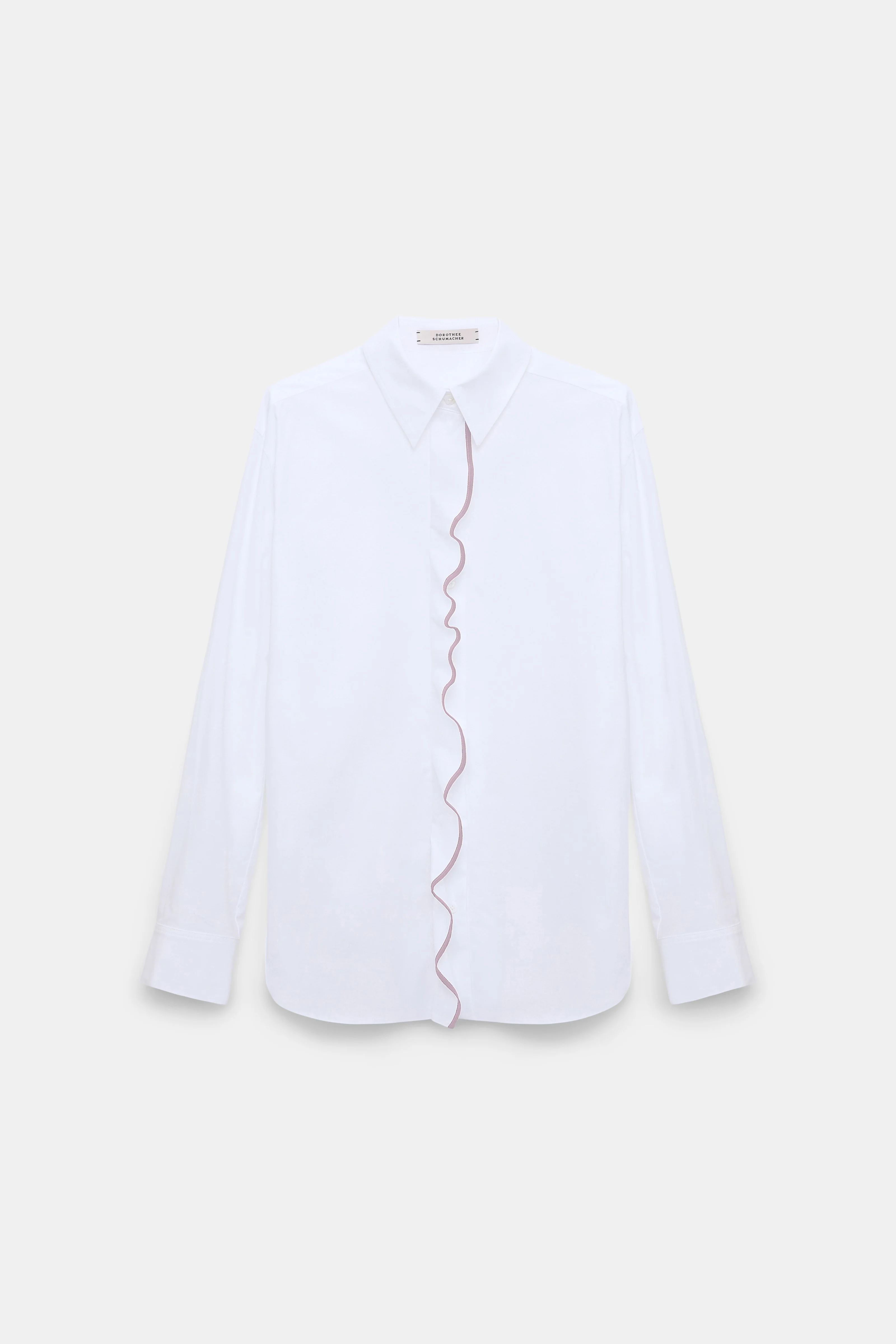 The cotton poplin shirt has a relaxed fit and features a ruffle hidden button placket with contrast piping. The shirt has button slit cuffs with contrast piping and a back yoke with a single pleat. Material & Care - 97 % Cotton, 3 % Elastane - Cotton poplin shirt - Classic shirt collar - Ruffle placket with hidden buttons - Contrast piping on the placket and cuff slits. - Back yoke with box pleat - Hand wash program / Machine wash - Wash with similar colors Size & Fit - Our Model is 178cm tall and wears a size 2. - Slight dropped shoulders - Relaxed fit