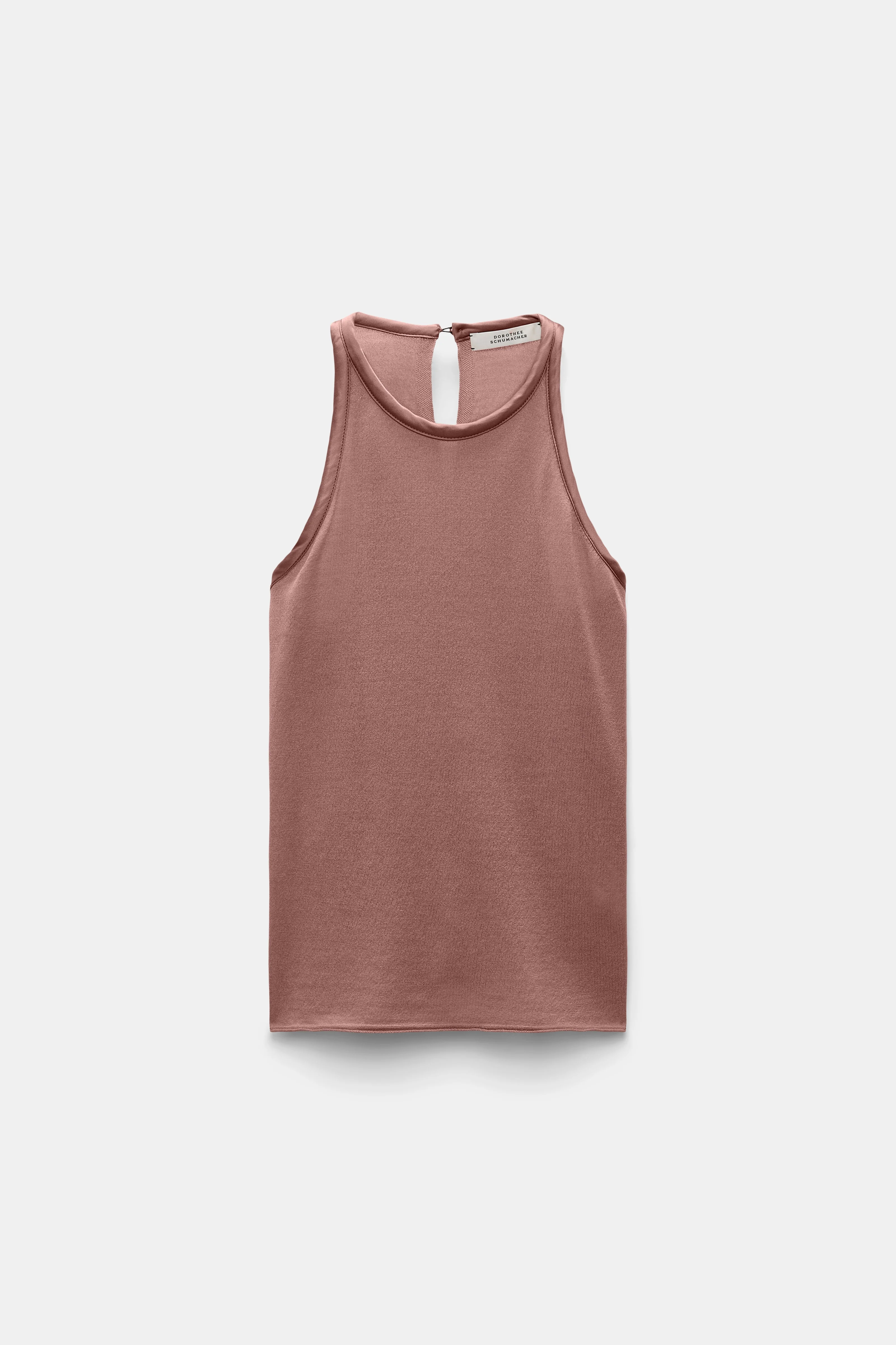 Let's talk details: The tank top is crafted in a smooth virgin wool-cotton mix and has cut-in shoulders. The fitted style has lightly padded tonal silk trim, which traces the round neckline and arm holes. Material & Care - 52 % Virgin Wool, 48 % Cotton - Virgin wool-cotton knit tank top - Lightly padded silk trim around the neckline and arm holes - Round neckline with buttoned slit at the nape - WE CARE - The yarn is mulesing-free - Hand wash cold / Machine wash cold - Wash with similar colors Size & Fit - Fitted