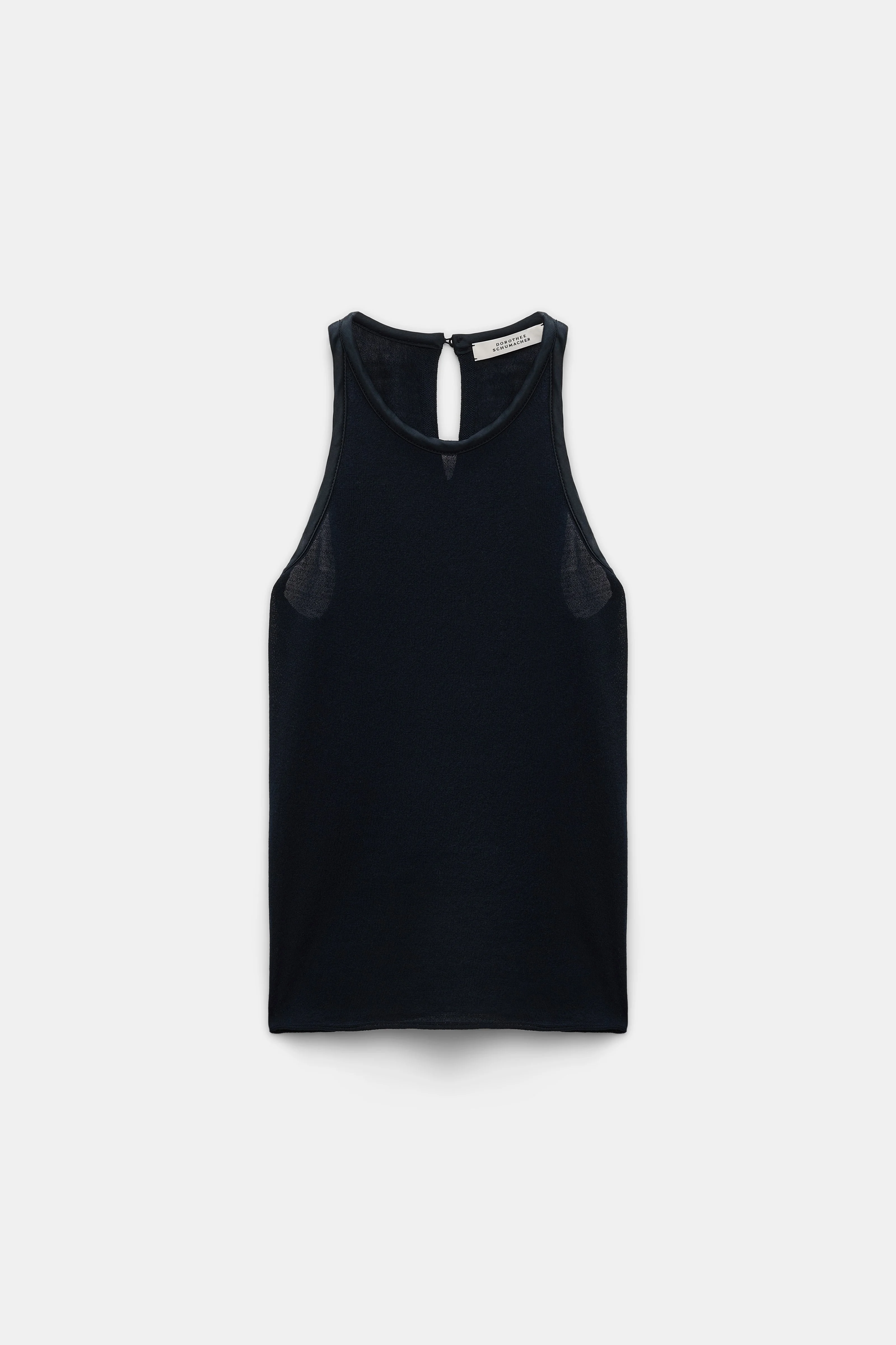 Let's talk details: The tank top is crafted in a smooth virgin wool-cotton mix and has cut-in shoulders. The fitted style has lightly padded tonal silk trim, which traces the round neckline and arm holes. Material & Care - 52 % Virgin Wool, 48 % Cotton - Virgin wool-cotton knit tank top - Lightly padded silk trim around the neckline and arm holes - Round neckline with buttoned slit at the nape - WE CARE - The yarn is mulesing-free - Hand wash cold / Machine wash cold - Wash with similar colors Size & Fit - Our model is 180cm tall and wears a size 2 - Fitted