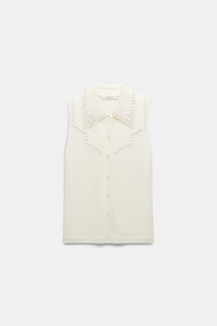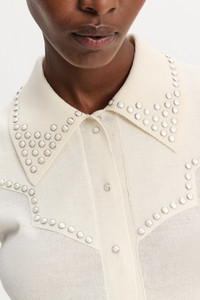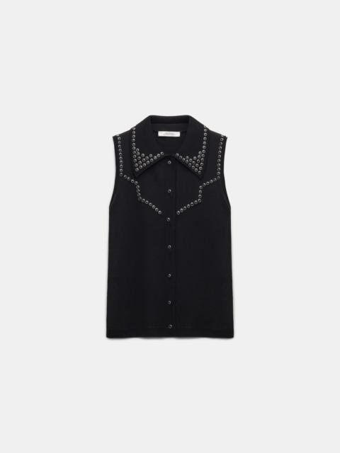 The sleeveless snap front shirt has Western-inspired stitching, which is embellished with lines of studded trim. Material & Care - 52 % Virgin Wool, 48 % Cotton - Snap front sleeveless knit shirt with polo collar - Collar, placket and Western-inspired stitching embellished with decorative rivets - WE CARE - This item is finished according to STANDARD 100 by OEKO-TEX, 22.0.98928 Hohenstein HTTI - WE CARE - Yarn content is finished according to Responsible Wool Standard (RWS) - WE CARE - Yarn content is finished according to Responsible Wool Standard (RWS) - Hand wash cold / Machine wash cold - Wash with similar colors - No dry cleaning Size & Fit - Our model is 179 cm tall and wears a size S - Fitted