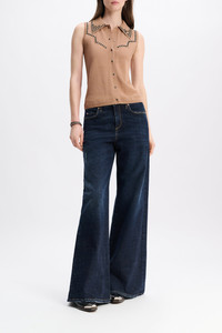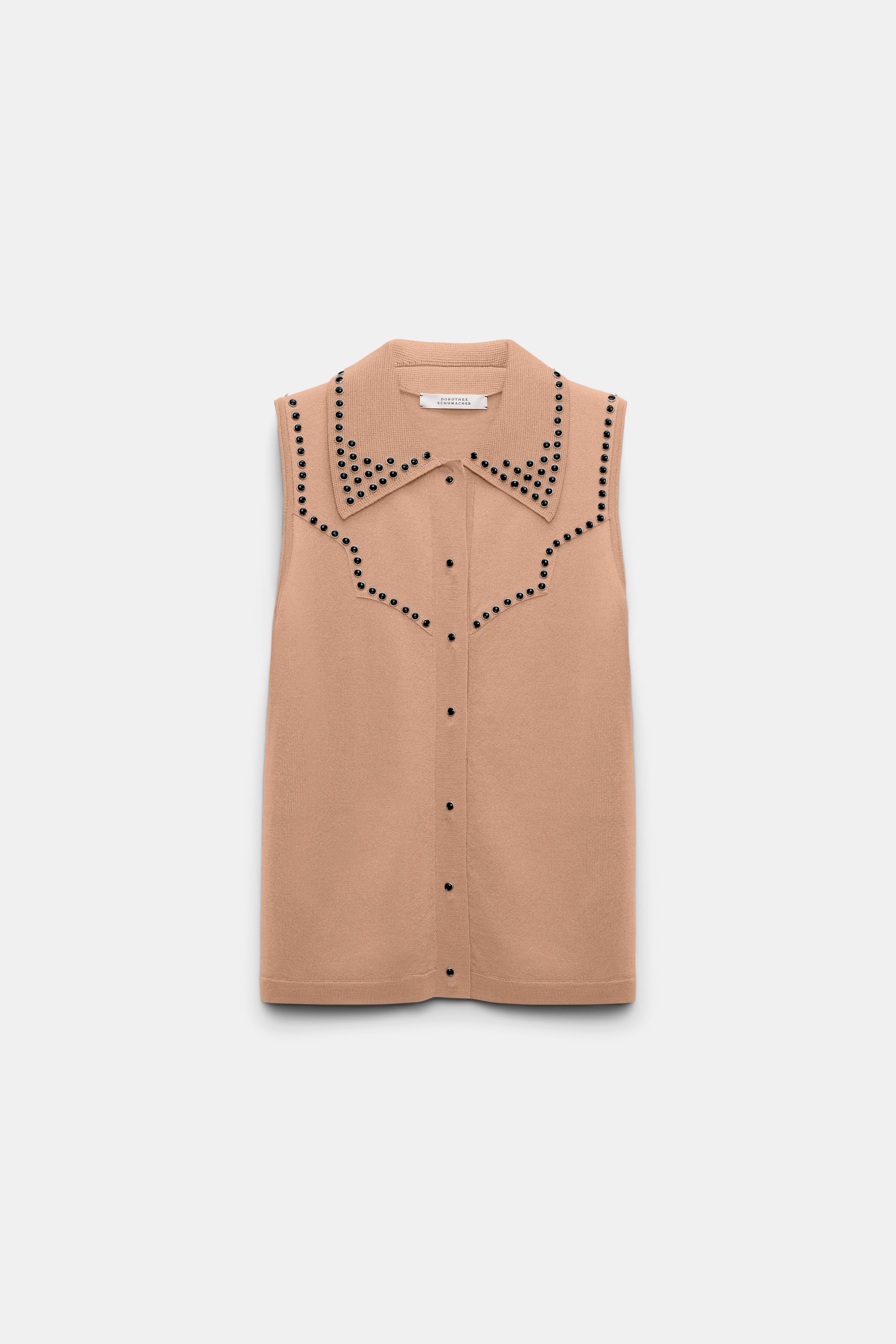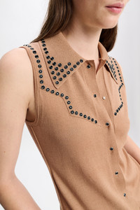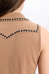 The sleeveless snap front shirt has Western-inspired stitching, which is embellished with lines of studded trim. Material & Care - 52 % Virgin Wool, 48 % Cotton - Snap front sleeveless knit shirt with polo collar - Collar, placket and Western-inspired stitching embellished with decorative rivets - WE CARE - This item is finished according to STANDARD 100 by OEKO-TEX, 22.0.98928 Hohenstein HTTI - WE CARE - Yarn content is finished according to Responsible Wool Standard (RWS) - WE CARE - Yarn content is finished according to Responsible Wool Standard (RWS) - Hand wash cold / Machine wash cold - Wash with similar colors - No dry cleaning Size & Fit - Our model is 180 cm tall and wears a size S - Fitted