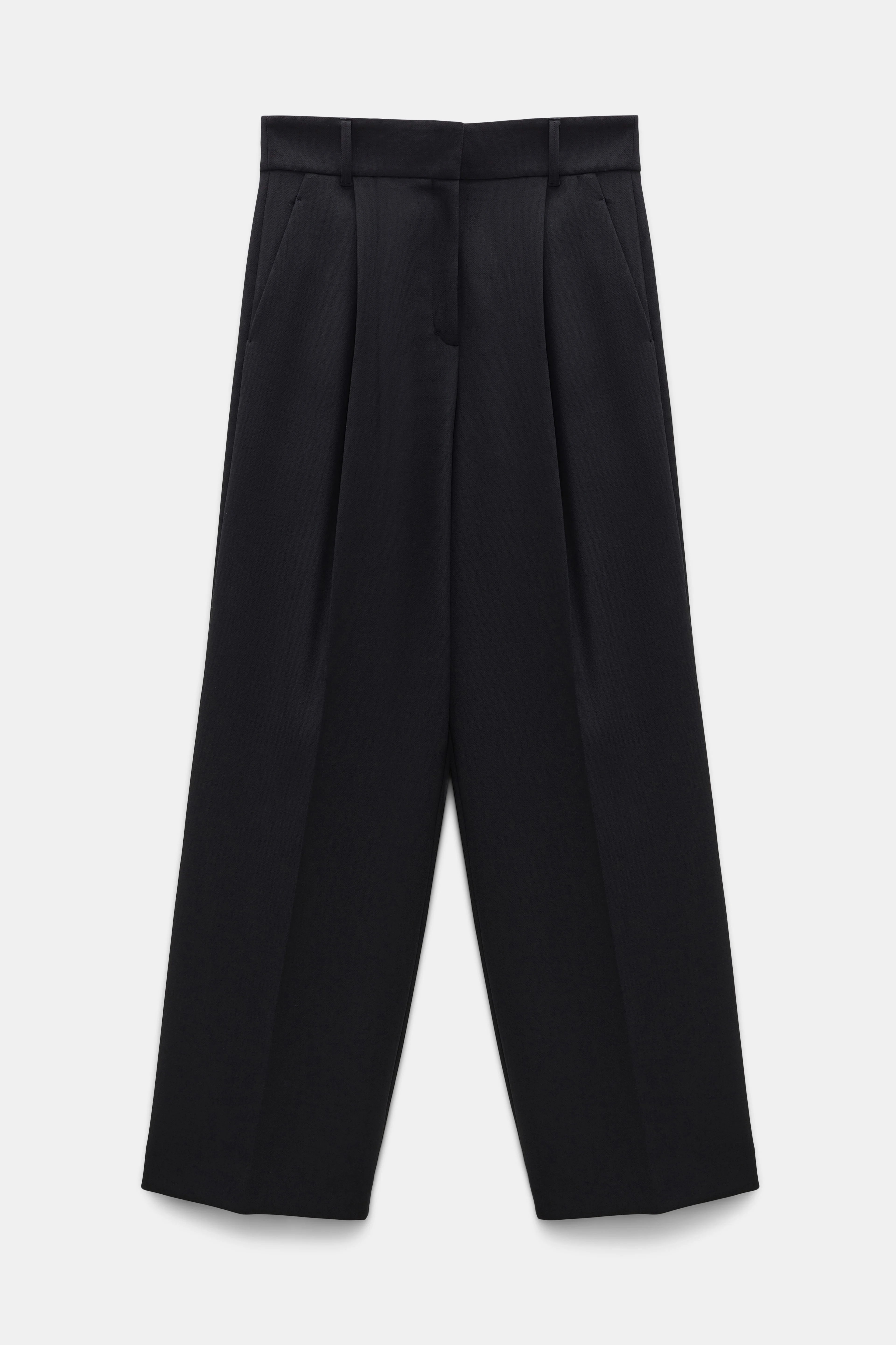 Styled with pleating and an XL wide leg, the high-waisted pants are both directional and easy to wear. We're dressing them up with the matching blazer and down with T-shirts and knitwear. Material & Care - 53 % Polyester, 43 % Virgin Wool, 4 % Elastane - Wide leg pleated pants - Pressed pleats on the front - Hidden fly closure - Side pockets - Back welt pockets - Belt loops with back button detail Size & Fit - Our model is 177cm tall and wears a size S - High rise - Fitted from the waist through the hip - Lightly flared from the hip to hem