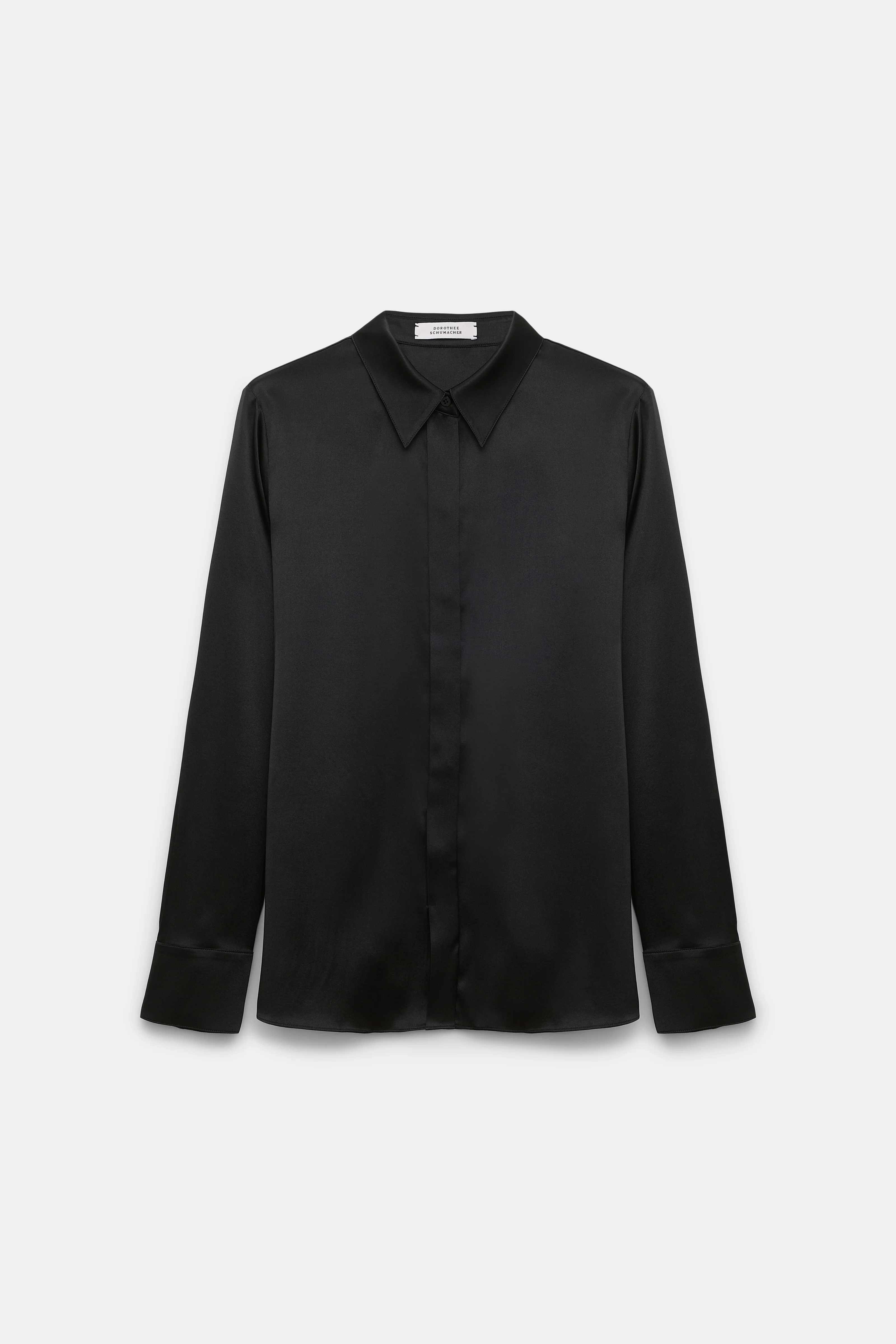 The blouse is made from stretch silk satin and is fitted. The essential style has a classic collar and side slits. Material & Care - 95 % Silk, 5 % Elastane - Stretch silk satin blouse - Hidden button placket - Classic shirt collar - Side slits Size & Fit - Fitted shoulders - Fitted
