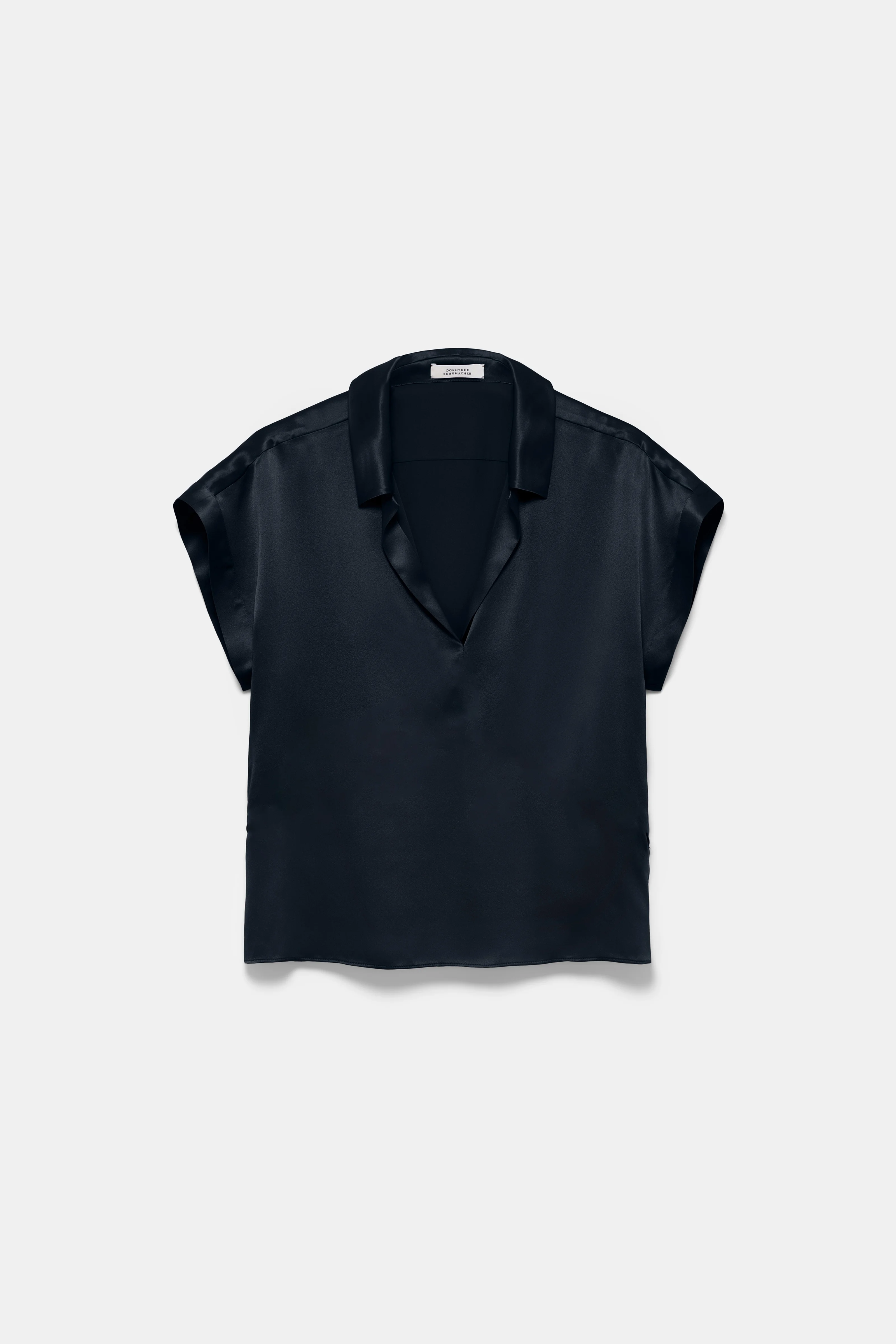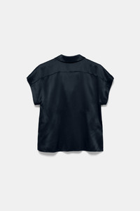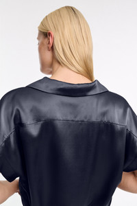 Styled with an open collar and popover silhoeutte, the silk charmeuse blouse is both simple and striking. The soft shine style has short cap sleeves with stitched cuffs and a boxy drape. For a dress-like look, mix ad match with the bias cut skirt. Material & Care - 100 % Silk - Silk charmeuse boxy blouse - Open neckline with petite notched collar - Decorative seams angle to the outside with babylock trim - Slightly turned-up front hem - Back yoke - Hand wash cold / Machine wash cold - Wash with similar colors - Shield from sharp items Size & Fit - Our model is 178cm tall and wears a size 2 - Boxy fit - Slight dropped shoulders