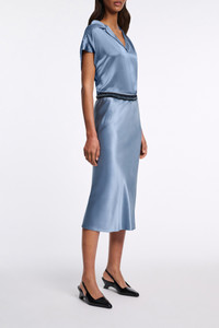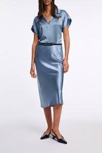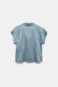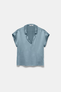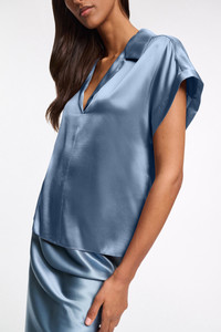 Styled with an open collar and popover silhoeutte, the silk charmeuse blouse is both simple and striking. The soft shine style has short cap sleeves with stitched cuffs and a boxy drape. For a dress-like look, mix ad match with the bias cut skirt. Material & Care - 100 % Silk - Silk charmeuse boxy blouse - Open neckline with petite notched collar - Decorative seams angle to the outside with babylock trim - Slightly turned-up front hem - Back yoke - Hand wash cold / Machine wash cold - Wash with similar colors - Shield from sharp items Size & Fit - Our model is 178cm tall and wears a size 2 - Boxy fit - Slight dropped shoulders