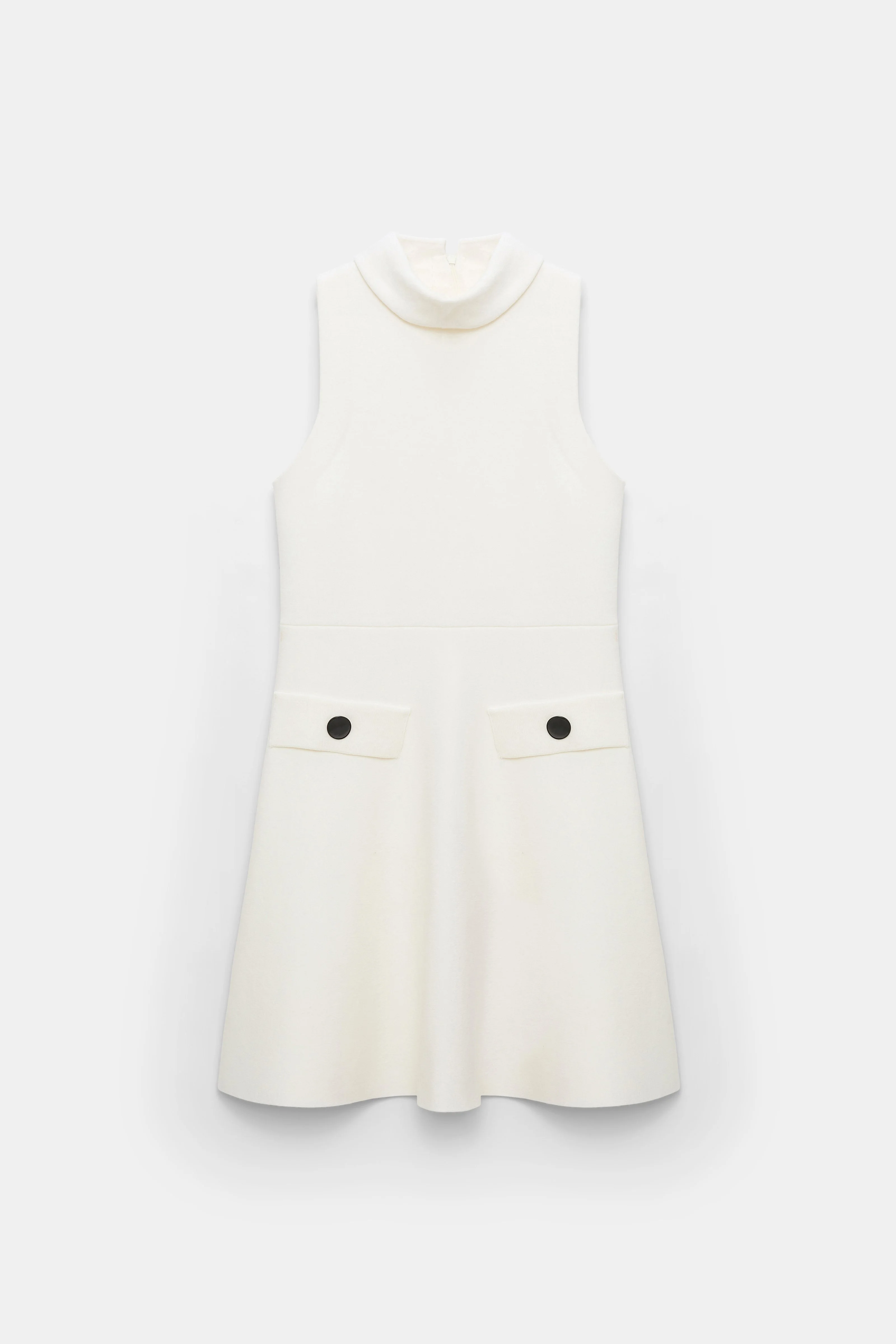 Channeling a retro-modern vibe, the sleeveless knit dress has a turtleneck collar and flared swing skirt. The sleeveless style is made from a double-face Merino blend and has decorative button pockets. The dress can be worn as a set with the matching jacket. Material & Care - 71 % Virgin wool (Merino), 26 % Polyamide, 3 % Elastane - Sleeveless knit turtleneck dress - Double-face stretch Merino blend - Double layer, relaxed turtleneck with a small center back zip - 2 Trompe-l'œil patch pockets - WE CARE - The wool content is mulesing-free - WE CARE - The wool yarn is finished according to globally recognized standards promoting animal welfare and land management. - Hand wash cold / Machine wash old - Wash with similar colors Size & Fit - Our model is 178cm tall and wears a size 2 - Fitted bodice - Special stretch technique gives the skirt a wide, swing silhouette - Shoulder-free