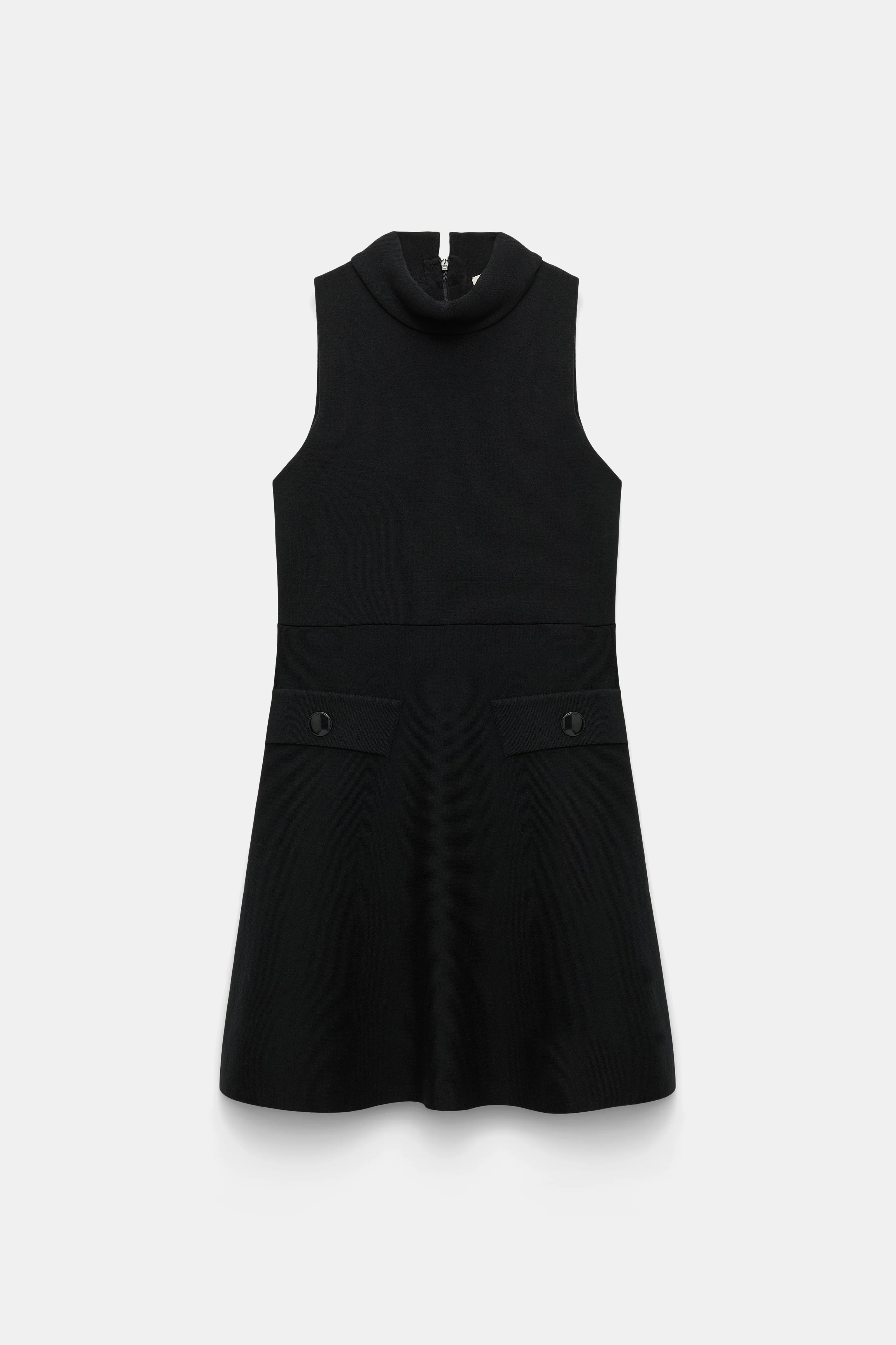 Channeling a retro-modern vibe, the sleeveless knit dress has a turtleneck collar and flared swing skirt. The sleeveless style is made from a double-face Merino blend and has decorative button pockets. The dress can be worn as a set with the matching jacket. Material & Care - 71 % Virgin wool (Merino), 26 % Polyamide, 3 % Elastane - Sleeveless knit turtleneck dress - Double-face stretch Merino blend - Double layer, relaxed turtleneck with a small center back zip - 2 Trompe-l'œil patch pockets - WE CARE - The wool content is mulesing-free - WE CARE - The wool yarn is finished according to globally recognized standards promoting animal welfare and land management. - Hand wash cold / Machine wash old - Wash with similar colors Size & Fit - Our model is 180cm tall and wears a size 2 - Fitted bodice - Special stretch technique gives the skirt a wide, swing silhouette - Shoulder-free
