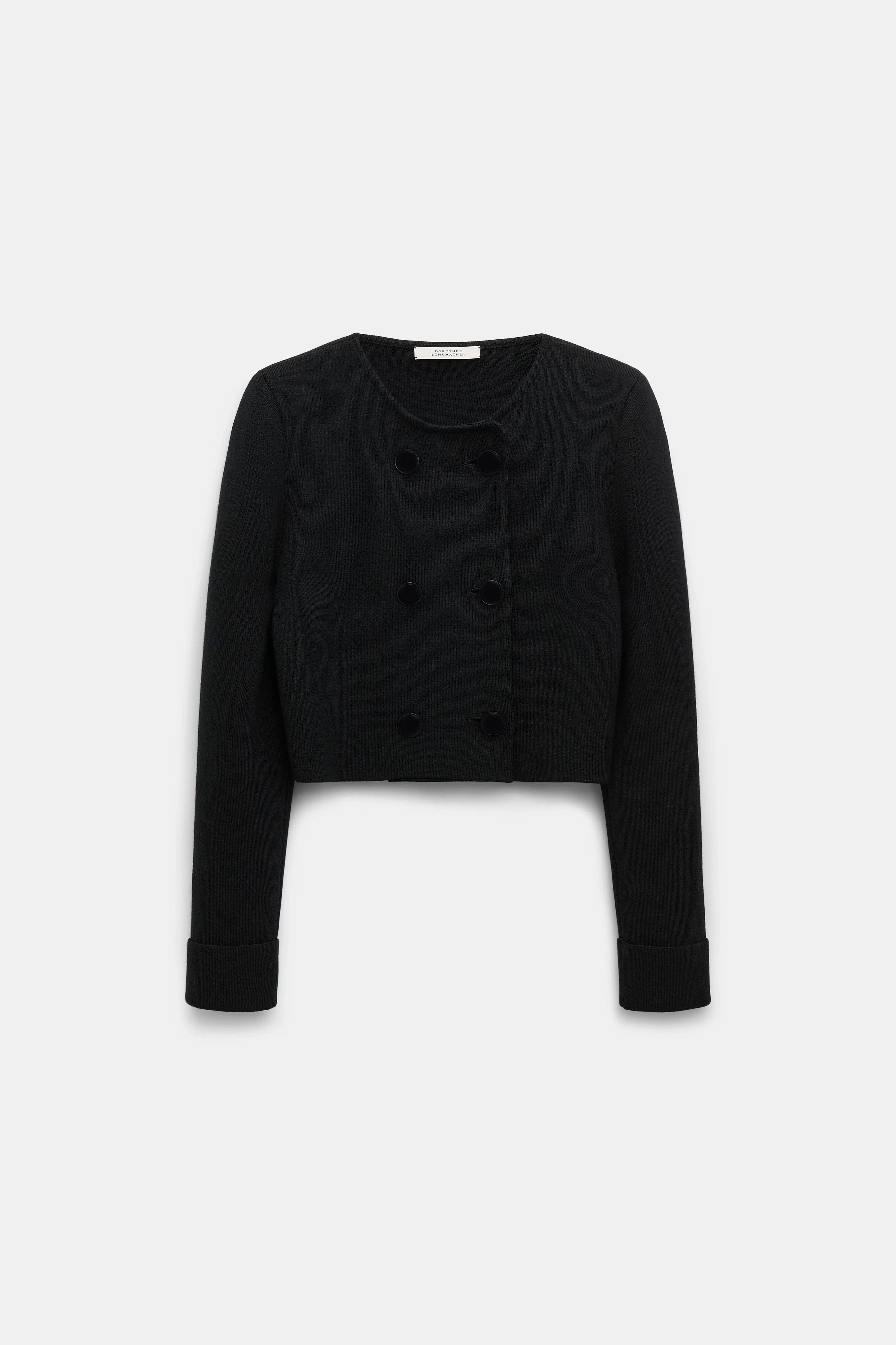 Channeling a retro-modern vibe, the knit jacket is collarless and features a double-breasted front and metal buttons. The jacket has turned-up cuffs and is made from a double-face Merino blend. The jacket can be worn as a set with the matching dress. Material & Care - 82 % Virgin Wool, 16 % Polyamide, 2 % Elastane - Round neck knit jacket - Double-face stretch Merino blend - Double-breasted with metal button closures - Turned-back cuffs - WE CARE - The wool content is mulesing-free - WE CARE - The wool yarn is finished according to globally recognized standards promoting animal welfare and land management. - Hand wash cold / Machine wash old - Wash with similar colors Size & Fit - Our model is 179cm tall and wears a size 2 - Cropped, close fit - Fitted shoulders