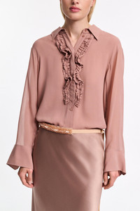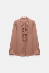 The silk-georgette shirt has a classic collar and sheer long sleeves. The body is two layers, and has a partially concealed button placket with gathered ruffle ribbon trim. Material & Care - 100 % Silk - Silk-georgette shirt with ruffle detail - Classic shirt collar - Double layer body - Concealed button placket at the top with gathered ribbon ruffle trim - Transparent sleeves with wide cuffs - WE CARE - This item is finished according to STANDARD 100 by OEKO-TEX, 22.0.98928 Hohenstein HTTI - Hand wash program / Machine wash - Wash with similar colors - Contains non-textile parts of animal origin Size & Fit - Our model is 178cm tall and wears a size 2 - Oversized - Dropped shoulders