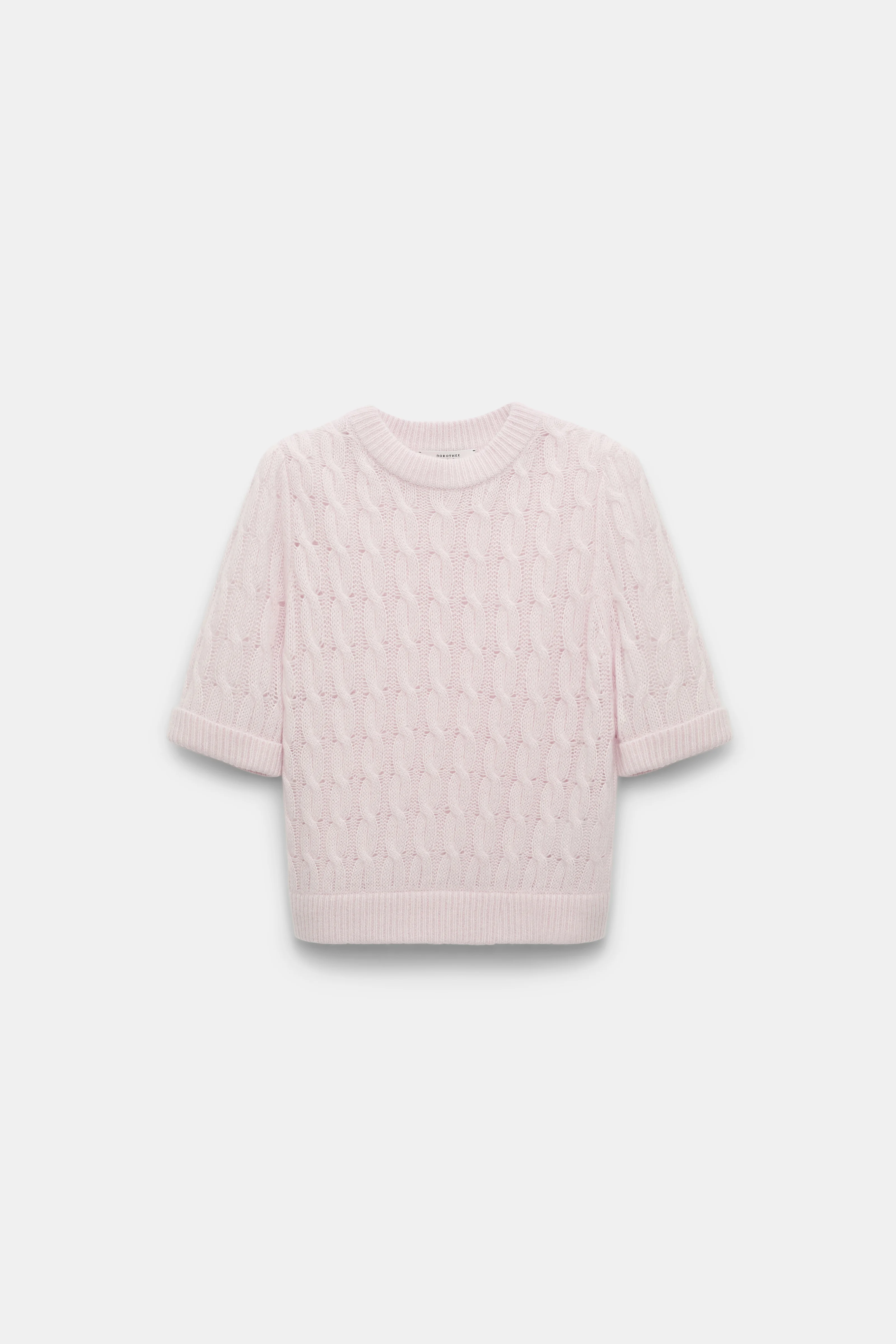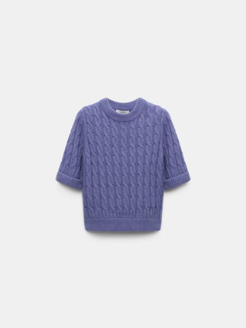 Knit with alpaca, the cable knit pullover has an extra soft finish. The top has short sleeves and ribbed knit trim. Material & Care - 35 % Polyamide, 30 % Lyocell, 20 % Wool, 15 % Alpaca - Cable knit short sleeve pullover with alpaca - Round neckline - WE CARE - This item is finished according to OEKO-TEX® STANDARD 100, 22.0.98928 Hohenstein - Hand wash cold / Machine wash old - Wash with similar colors Size & Fit - Our model is 179cm tall and wears a size 2 - Loosely fitted