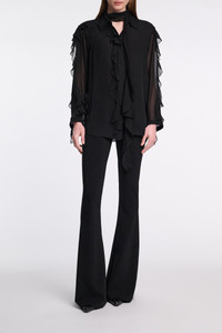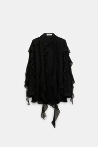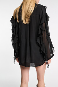 The ruffle blouse is made from double- and single silk georgette and comes with a matching scarf. The blouse has an oversized fit and cascading ruffles on the sleeves. Material & Care - 100 % Silk - Silk double- and single georgette blouse with ruffles - Classic collar - Ruffles on the sleeves - Hidden button placket - Separate scarf - Hand wash program / Machine wash - Wash with similar colors Size & Fit - Our model is 180 cm tall and wears a size S - Oversized - Dropped shoulders