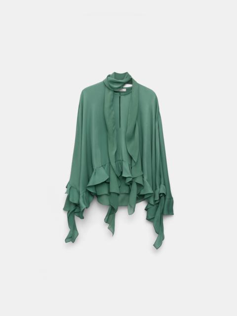 The dynamic blouse is made from double silk georgette and comes with a matching scarf. The blouse has an oversized, cape-like drape and is finished with ruffle flounces at the cuffs and hem. Material & Care - 100 % Silk - Cape-style blouse in silk double georgette - Round neckline - Center front slit - Integrated top in single georgette - Separate scarf in single georgette - Handwaschprogramm / Maschinenwasche - Mit ahnlichen Farben waschen - Remove all detachable parts before cleaning - Contains non-textile parts of animal origin Size & Fit - Our model is 180 cm tall and wears a size S - Oversized - Voluminous drape
