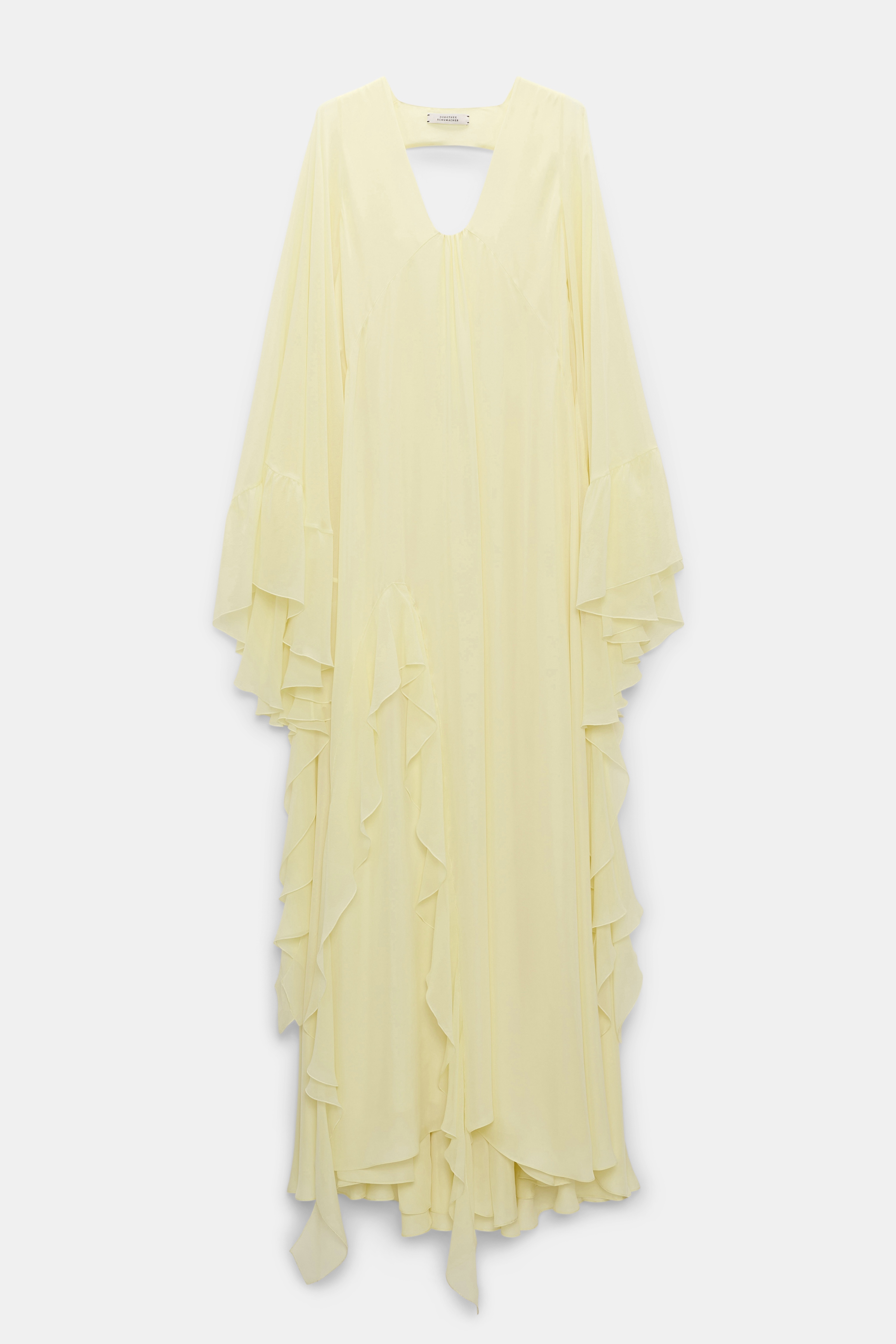 Unforgettable festival memories start here: The ruffle maxi dress is made from double- and single silk georgette and comes with a matching scarf. The dress has a low cut back and dramatic caftan sleeves with soft ruffles at the cuffs. Material & Care - 100 % Silk - Festival maxi dress in silk double- and single georgette - Low cut back - Dramatic caftan sleeves with ruffles - Separate ruffle scarf - Handwaschprogramm / Maschinenwasche - Mit ahnlichen Farben waschen - Remove all detachable parts before cleaning Size & Fit - Our model is 179 cm tall and wears a size S - Fitted shoulders - XL volume at the hem