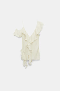 The ruffle top is made from double silk georgette and has spaghetti- and ruffle straps. The top is fitted and has a soft bias drape. Material & Care - 100 % Silk - Silk double georgette top with ruffles - Spaghetti- and ruffle straps - Bias cut body - Handwaschprogramm / Maschinenwasche - Mit ahnlichen Farben waschen Size & Fit - Our model is 178 cm tall and wears a size S - Fitted