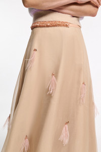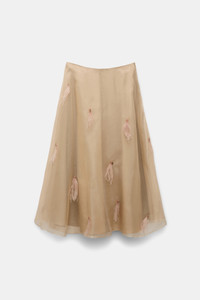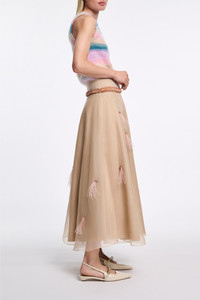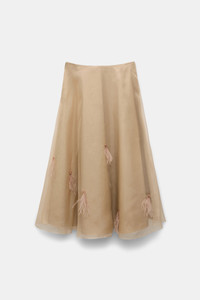 The midi skirt has a silk organza top layer, which is hand-embellished with feathers and beads. The under layer of the skirt is cotton poplin. Material & Care - 100 % Silk - Double-layer midi skirt in silk organza and cotton poplin - Hand-embellished with feathers and beads - Smooth waistband - Dry clean only - No optical brighteners - Do not expose to extreme light - Shield from sharp items Size & Fit - Our model is 178cm tall and wears a size 2 - Fitted waist - Voluminous skirt