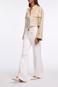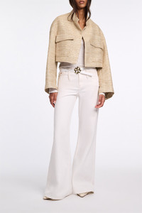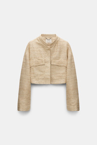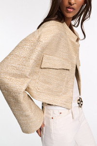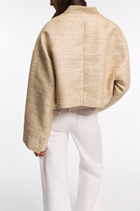 The perfect mix of shine & sophistication: The Lurex-tweed jacket has a boxy silhouette and short stand collar. The jacket can be worn as a set with the matching shift dress. Material & Care - 49 % Polyester, 35 % Cotton, 11 % Polyacrylic, 3 % metallized polyester, 2 % Polyamide - Lurex-tweed cropped jacket. - Stand collar - Flap pockets - Dry clean only - No optical brighteners - Do not expose to extreme light - Shield from sharp items Size & Fit - Our model is 178cm tall and wears a size 2 - Boxy fit