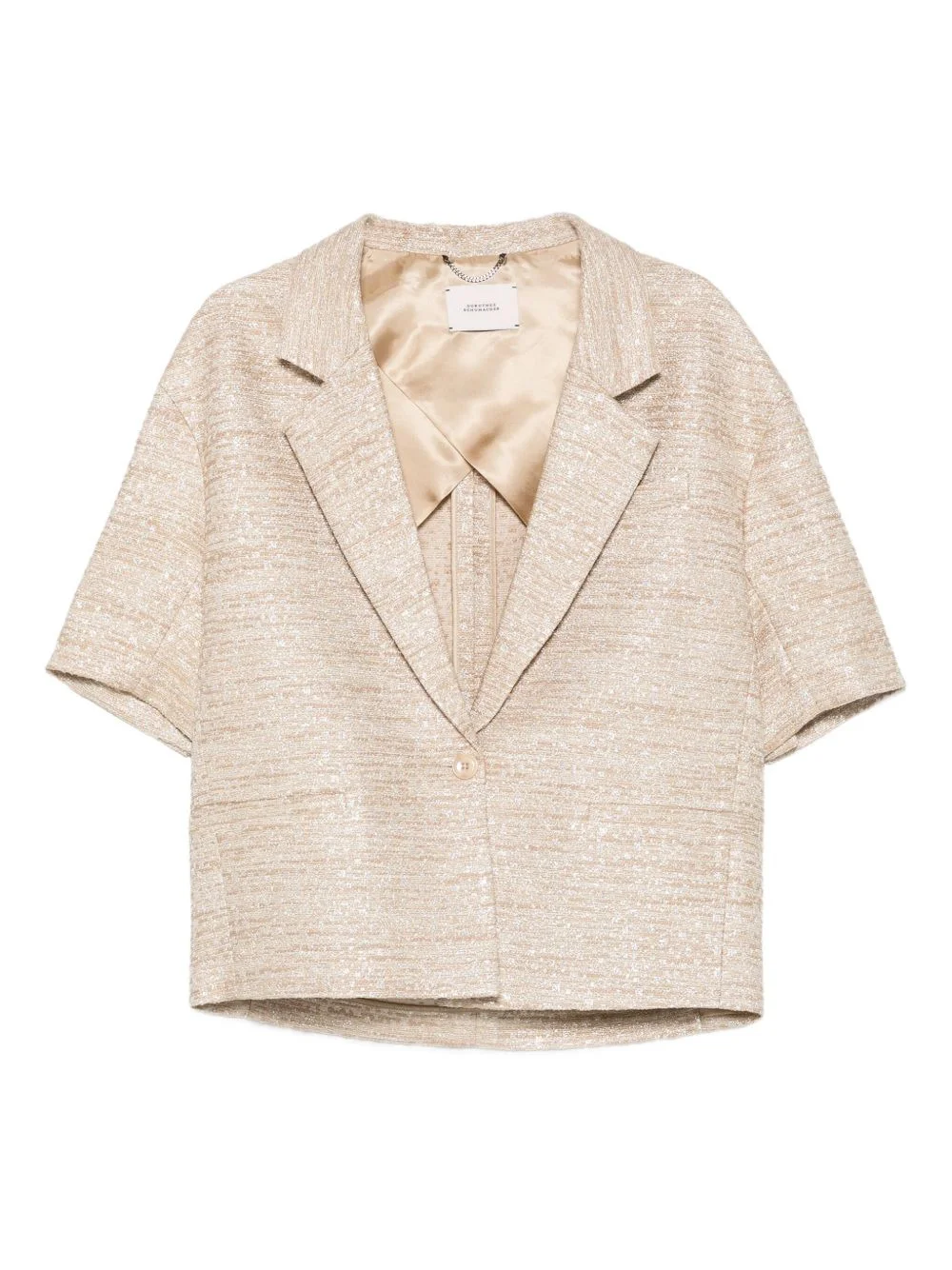 short-sleeved tweed jacket Highlights - Gold-tone - Tweed - Short sleeves - Notched lapel - Button fastening - Cropped length Imported Composition Outer: Polyester 49%, Cotton 35%, Acrylic 11%, Metallised Fibres 3%, Polyamide 2% Lining: Viscose 100% Washing instructions Dry Clean Only