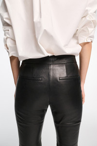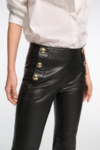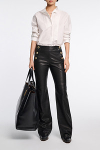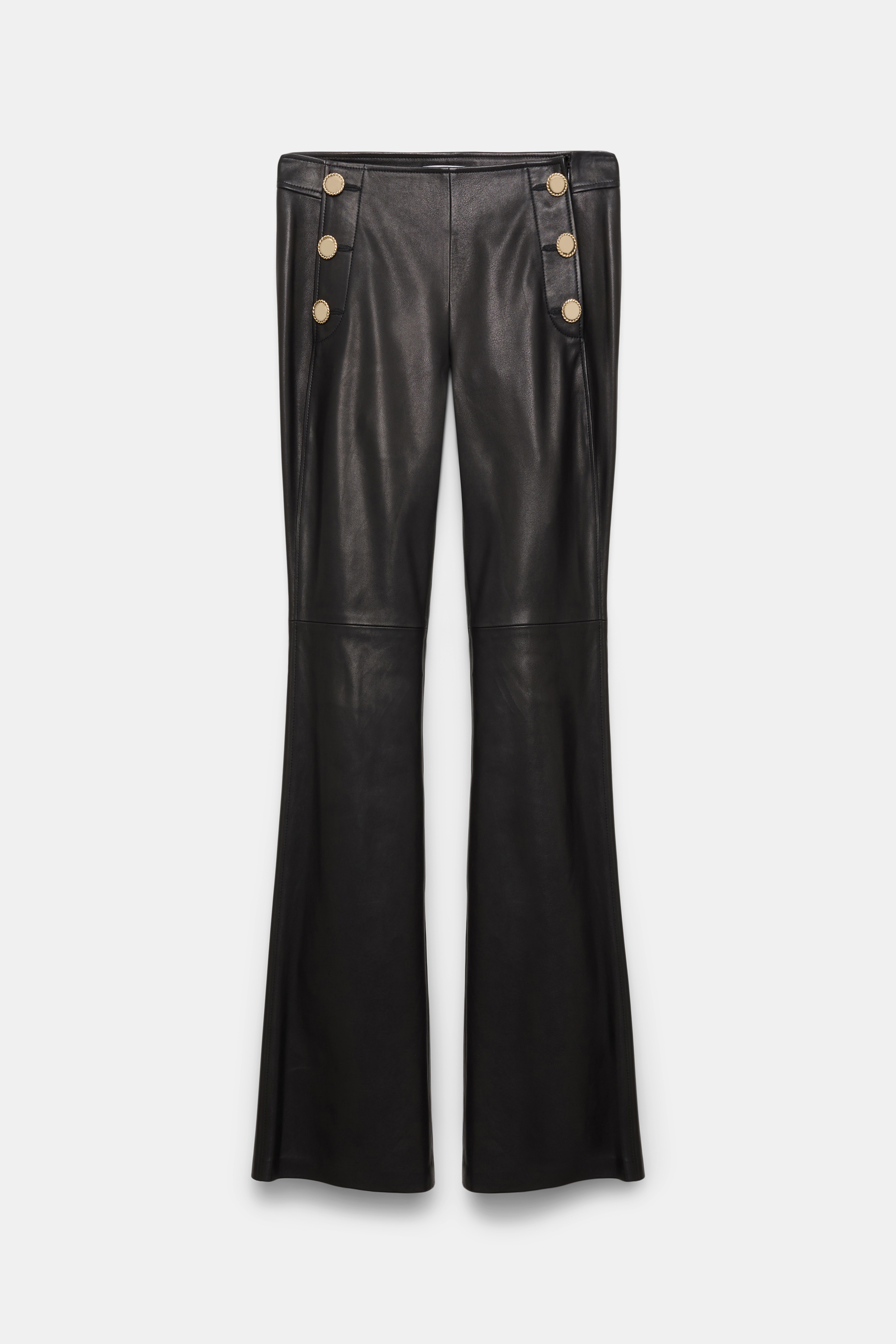 The bootcut pants are made from soft lambskin- The pants have a decorative sailor-style front with gold-tone buttons and a hidden side zip closure. Material & Care - 100 % Leather (lamb) - Lambskin bootcut pants - Sailor-style decorative front panel with gold-tone buttons - In-seam side zip closure - Back welt pockets Size & Fit - Our model is 178 cm tall and wears a size S - Fitted - Bootcut