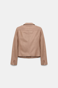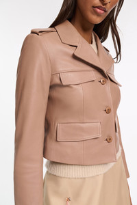 Luxury in lambskin: The cropped leather jacket features a slim fit and four flap pockets. The jacket has a peitite notched collar and epaulettes. Material & Care - 100 % Leather (lamb) - Cropped lambskin jacket - Notched collar - Flap pockets - Epaulettes - Back yoke - No dry cleaning - Do not wash - Colour changes in product may result from strong light irradiation - This garment may transfer onto light coloured materials Size & Fit - Our model is 178cm tall and wears a size 2 - Fitted - If a wider fit is desired, we recommend choosing one size larger