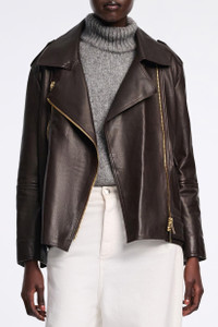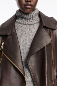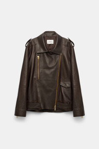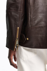 Made from soft Nappa leather, the biker jacket is a luxurious iteration of the iconic outerwear style. The jacket has epaulettes, and features gold-tone metal zippers. Material & Care - 100 % Leather (lamb) - Nappa leather biker jacket - Notched collar - Zippered pockets - Flap pockets - Epaulettes - Side tabs with belt loops - Hand wash cold / Machine wash old - Wash with similar colors Size & Fit - Our model is 180cm tall and wears a size 2 - Slightly oversized
