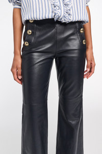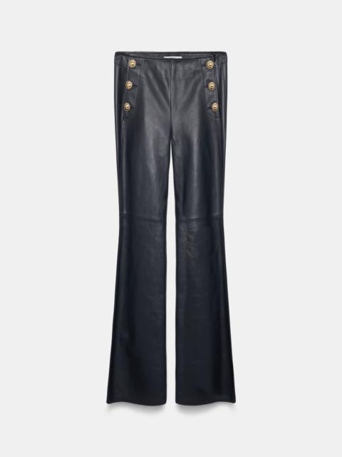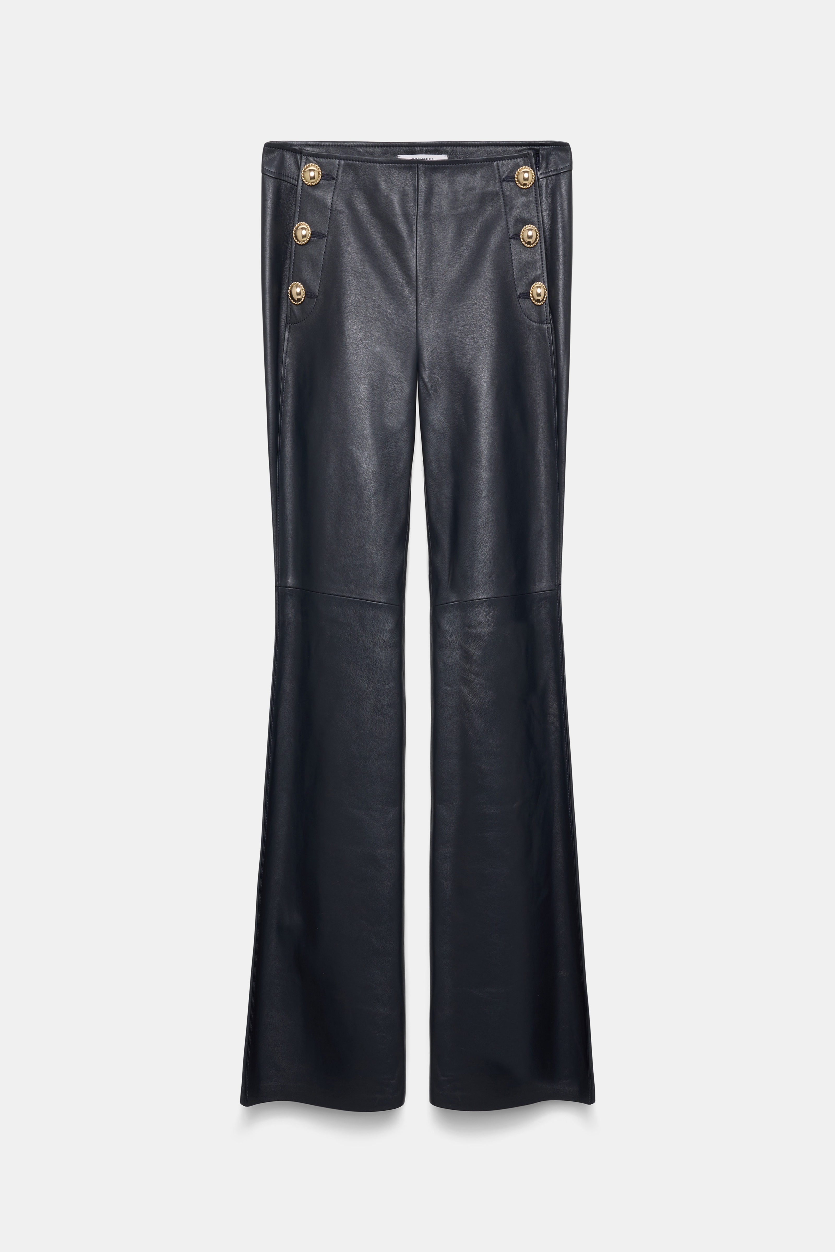 The bootcut pants are made from soft lambskin- The pants have a decorative sailor-style front with gold-tone buttons and a hidden side zip closure. Material & Care - 100 % Leather (lamb) - Lambskin bootcut pants - Sailor-style decorative front panel with gold-tone buttons - In-seam side zip closure - Back welt pockets Size & Fit - Our model is 178 cm tall and wears a size S - Fitted - Bootcut
