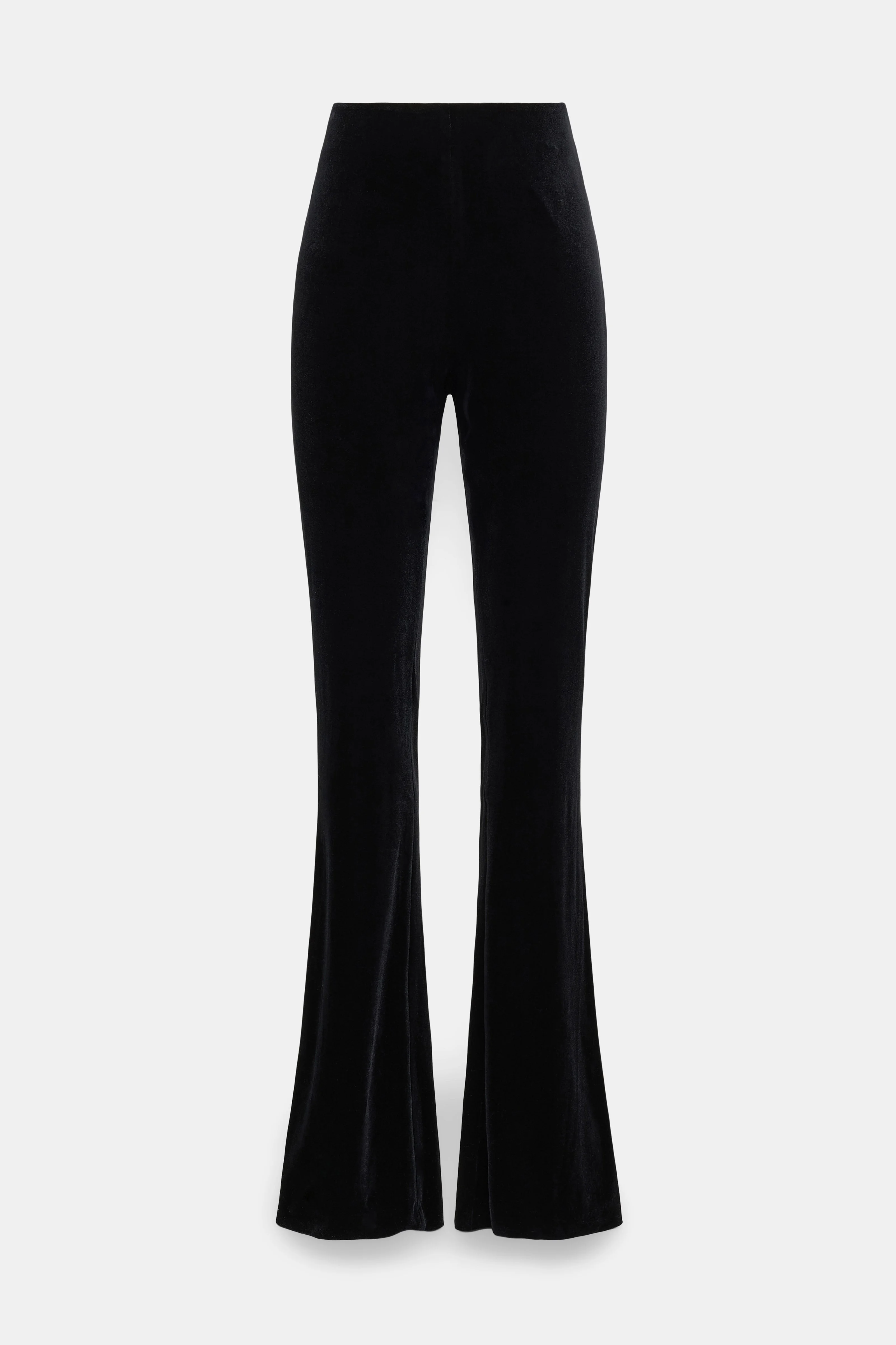 The flares are detailed in stretch velvet and channel a modern-retro feel. The pants have a hidden side zip closure and can be worn as a set with the matching top. Material & Care - 95 % Polyester, 5 % Elastane - Stretch velvet flares - Structured waistband - Hidden side zip closure - Accentuated welt pockets on the back - WE CARE - This item is finished according to OEKO-TEX® STANDARD 100, 22.0.98928 Hohenstein - Hand wash cold / Machine wash old - Wash with similar colors Size & Fit - Our model is 178cm tall and wears a size 2 - Fitted waist - Slight flared leg