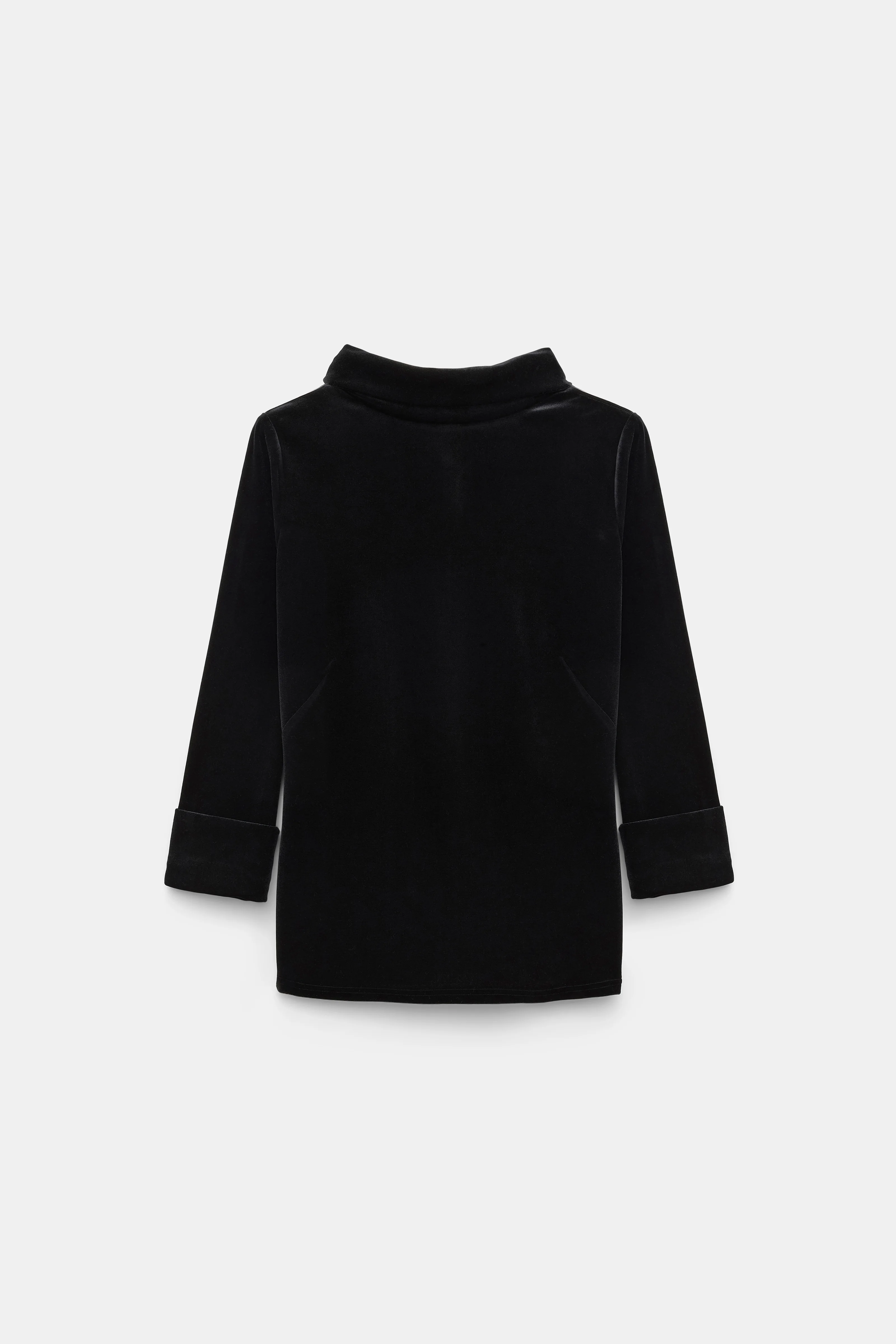The top is detailed in stretch velvet and channels a modern-retro feel with a wide mock neck. The top has 3/4-length sleeves with turned-up cuffs and can be worn as a set with the matching flares. Material & Care - 95 % Polyester, 5 % Elastane - Stretch velvet turtleneck - Turtleneck with padded inlay - 3/4 sleeves with turned-up cuffs - Double-needle stitched hem - Hand wash cold / Machine wash old - Wash with similar colors Size & Fit - Our model is 179cm tall and wears a size 2 - Form-fitting