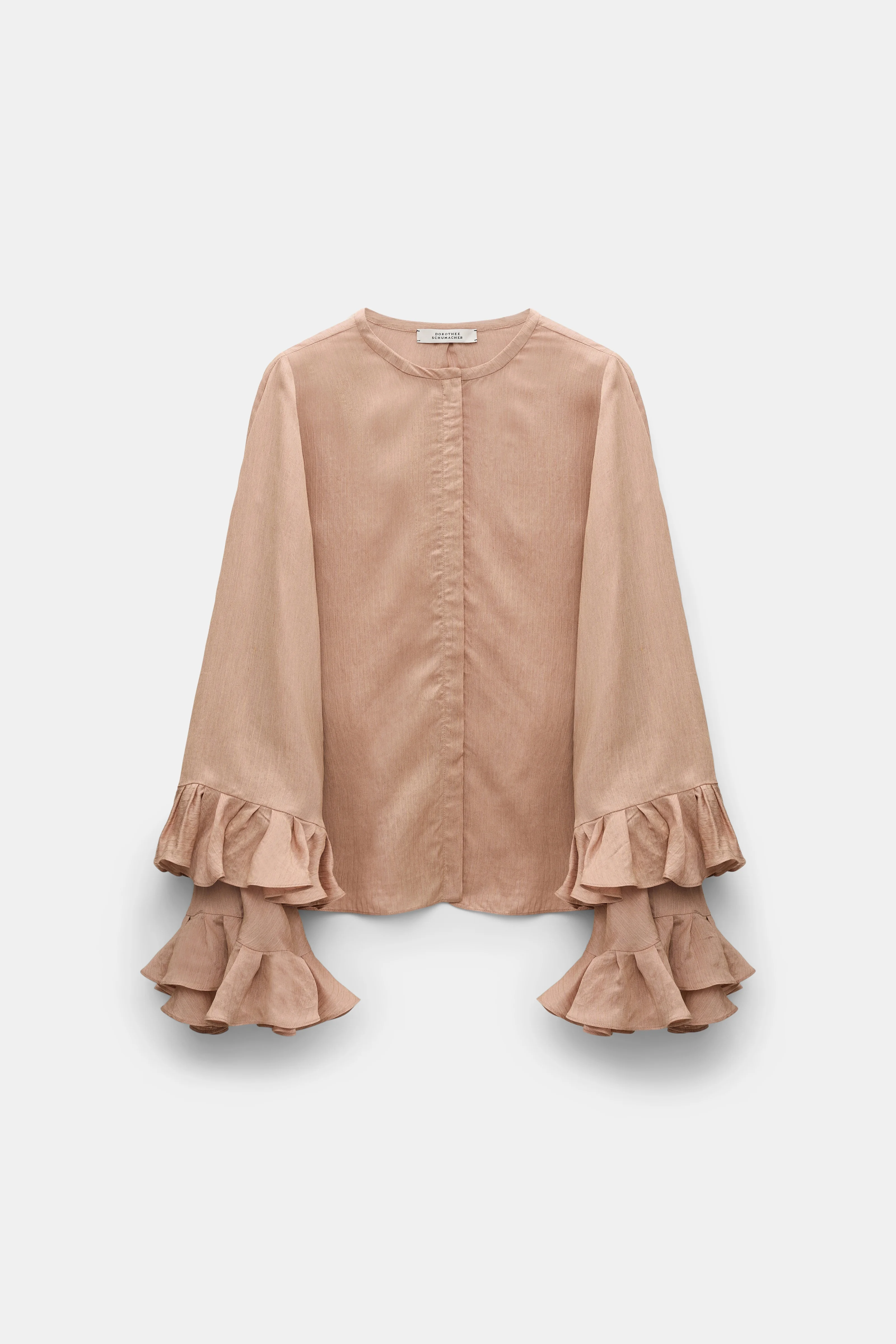 Double the flounce, double the fun: The fitted blouse is crafted in striped organdy voile and features dynamic flounce cuffs. The blouse has a short stand collar and flared sleeves. Material & Care - 84 % Viscose, 16 % Silk - Striped organdy voile blouse - Short stand collar - Hidden button placket - Double-layer, flared sleeves with set-in flounces - Very mild fine wash wool-silk cycle / Cold wash / No hand wash - Wash with similar colors - Contains non-textile parts of animal origin Size & Fit - Our model is 178cm tall and wears a size 2 - Fitted - Flared caftan sleeves - Fitted shoulders