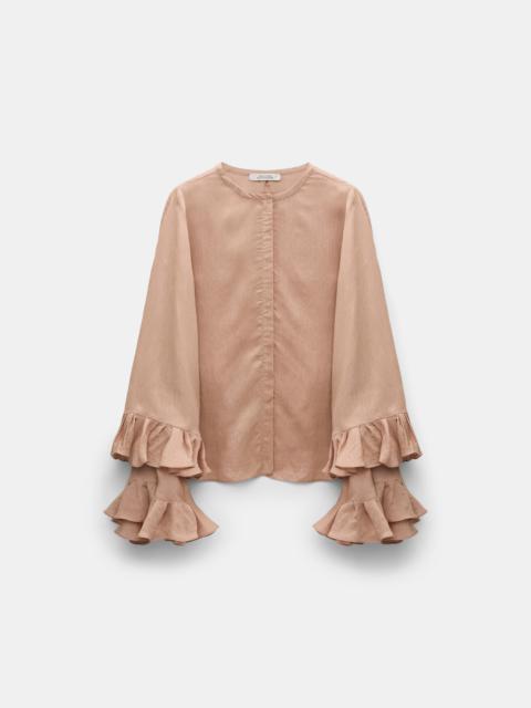 Double the flounce, double the fun: The fitted blouse is crafted in striped organdy voile and features dynamic flounce cuffs. The blouse has a short stand collar and flared sleeves. Material & Care - 84 % Viscose, 16 % Silk - Striped organdy voile blouse - Short stand collar - Hidden button placket - Double-layer, flared sleeves with set-in flounces - Very mild fine wash wool-silk cycle / Cold wash / No hand wash - Wash with similar colors - Contains non-textile parts of animal origin Size & Fit - Our model is 178cm tall and wears a size 2 - Fitted - Flared caftan sleeves - Fitted shoulders