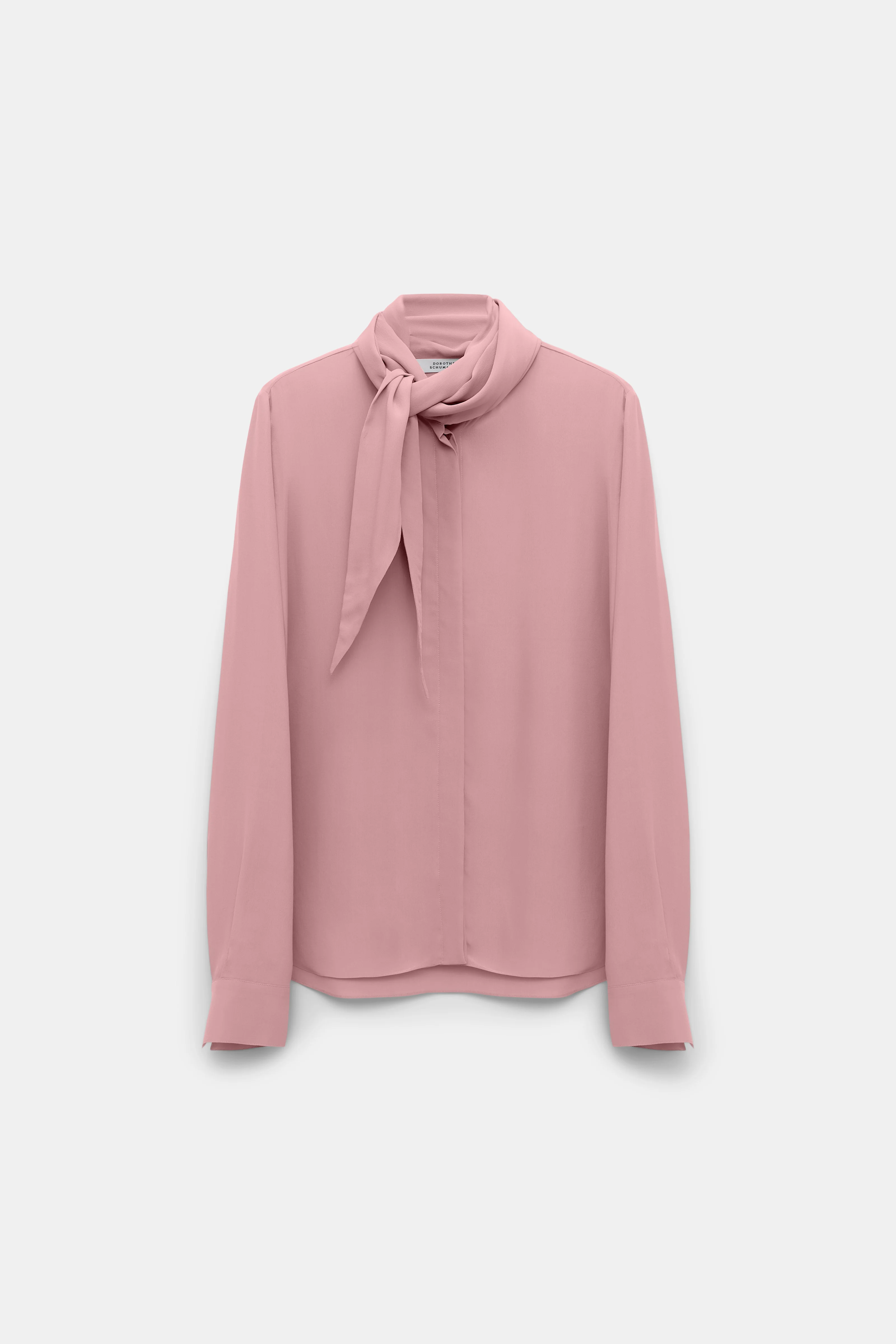 The blouse is styled in flowing silk-viscose crepe de Chine and has a wrap-around tie collar. The blouse has a concealed front placket and button cuffs. Material & Care - 60 % Viscose, 40 % Silk - Flowing silk-viscose crepe de Chine blouse with scarf detail - Concealed placket - Tie collar - Cuffs with covered buttons Size & Fit - Fitted shoulders - Relaxed fit