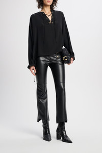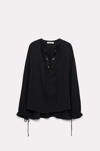 The silk bouse has an oversized fit and comes to a flounce at the hem. The neckline is laced and has metal eyelets. The long sleeves come to a gather with drawstring cuffs. Material & Care - 100 % Silk - Silk blouse with laced neckline - Sporty topstitching and metal eyelets - Gathered cuffs with ties - Hand wash program / machine wash - Use silk detergent - Wash and iron inside out - Wash with similar colors Size & Fit - Our model is 179 cm tall and wears a size S - Oversized - Dropped shoulders