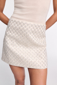 Dressed up in Duchesse: The mini-skirt is crafted in Duchesse and is embellished with floral sequin patterning. The skirt has an A-line silhouette and integrated shorts lining. The skirt can be worn as a set with the matching top. Material & Care - 87 % Polyester, 13 % Viscose - Sequin embellished A-line mini-skirt in Duchesse - Lining with integrated shorts - Dry clean only - No optical brighteners - Do not expose to extreme light - Shield from sharp items Size & Fit - Our Model is 176cm tall and wears a size 2. - Relaxed fit - Slight low waist