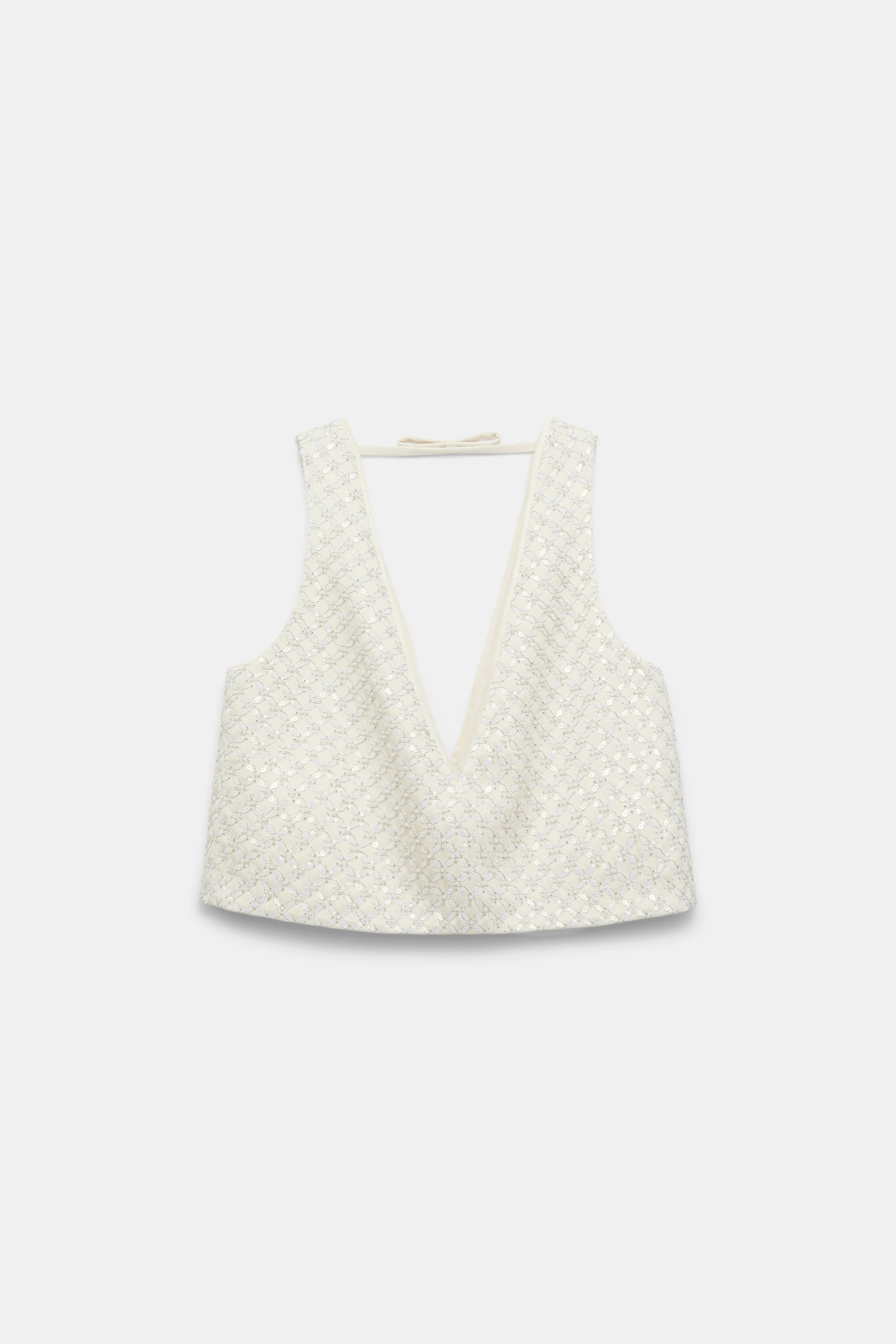Dressed up in Duchesse: The crop top is crafted in Duchesse and is embellished with floral sequin patterning. The top has a deep V front and back, and can be worn as a set with the matching skirt. Material & Care - 87 % Polyester, 13 % Viscose - Sequin embellished crop top in Duchesse - Deep V-neckline - Deep V-back with strap and bow at the top - Dry clean only - No optical brighteners - Do not expose to extreme light - Shield from sharp items Size & Fit - Our Model is 178cm tall and wears a size 2. - Sleeveless - Cropped, boxy silhouette