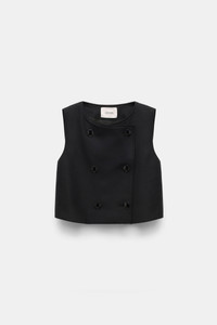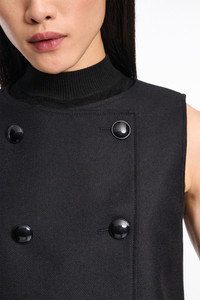 Made to match: The A-line shell is made from virgin wool and has double-breasted button closures, which channel a vest-like look. The top can be worn as a set with the matching coat, pants or mini-skirt. Material & Care - 100 % Virgin Wool - A-line shell in virgin wool - Back sash - Double-breasted - Hand wash cold / Machine wash old - Wash with similar colors Size & Fit - Our model is 180cm tall and wears a size 2 - A-line silhouette