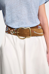 The suede belt has a curved shape and multicolor floral embroidery. Material & Care - 100 % Leather (calf) - Curved calf suede belt - Floral embroidery - Signature buckle - Calf suede lining - Black painted edges Size & Fit - Curved shape is designed to be worn on the hips - Width: 6 cm - Size measurement taken from middle hole to buckle pin