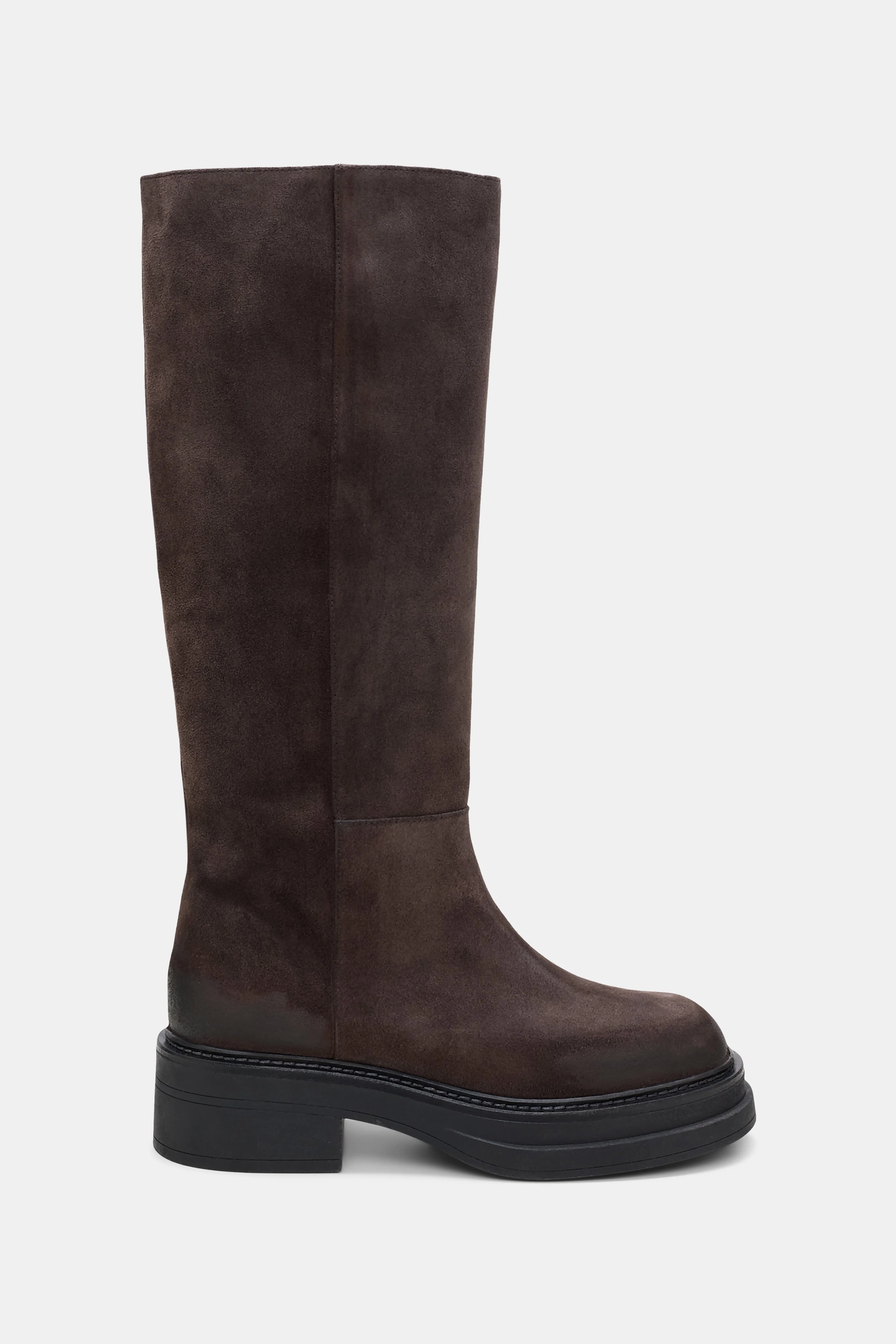 The tall waxed suede biker boots have a round toe and chunky platform heel. The boots pull on and have a straight shaft. Material & Care - 100 % Leather (calf) - Waxed suede tall boots - Waxed calf suede upper - Calf leather lining - Pulls on - Straight shaft - Chunky rubber sole Size & Fit - Fits true to size - Pulls on - Sole/heel height (size 37): 5.5 cm - Shaft back height (size 37): 40 cm