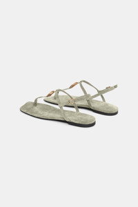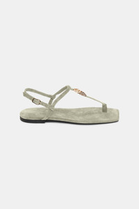 Embracing freedom and individuality. The flat sandals have a square toe and barely-there look. The T-strap is embellished with mixed texture D-rings. Material & Care - 100 % Leather (calf) - Flat T-strap sandals - Calf suede upper and lining - Square toe shape - Signature D-ring detail - Adjustable back strap with signature buckle - Slim insole is designed for a barely there look - Shiny tunit sole embossed with CATCH HER. IF YOU CAN. Size & Fit - Fits true to size - Adjustable back strap