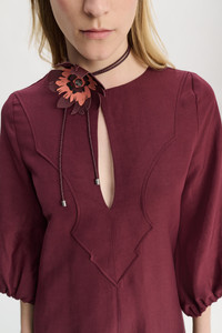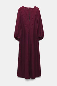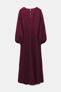 The prettiest way to do Western: The technical linen dress is defined by Western-inspired patterning. The A-line style has a slit front and 3/4-length sleeves which come into a gather at the cuff. Material & Care - 59 % Polyester, 41 % Linen - Western-inspired mid-length dress in technical linen - Round neckline with slit underneath - Hidden side zip closure - WE CARE - Fabric supplier produces according to 4sustainability - WE CARE - The polyester content is produced in accordance with the Global Recycled Standard (GRS) - Western-inspired loop on the back - WE CARE - Fabric supplier produces according to 4sustainability - WE CARE - The polyester content is produced in accordance with the Global Recycled Standard (GRS) - Hand wash programe / Machine wash - Wash with similar colors Size & Fit - Our model is 180 cm tall and wears a size S - Fitted - Flared skirt - Voluminous sleeves