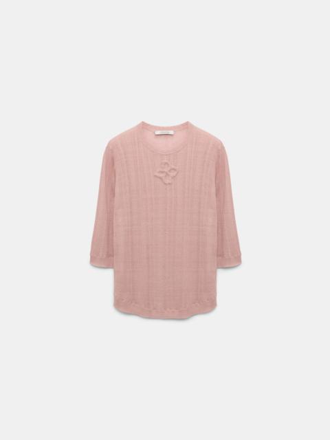 Everything is rosy. The linen blend top is ribbed and has elbow-length sleeves. The relaxed style has D-rose embroidery at the throat and crochet-like ribbed trim. Material & Care - 78 % Linen, 21 % Polyamide, 1 % Polyester - Linen-blend ribbed pullover - Round neckline with tonal D-rose relief embroidery at the front - Ribbed neckline and sleeve opening with ajour effect - Rounded hem - WE CARE - This item is finished according to STANDARD 100 by OEKO-TEX, 22.0.98928 Hohenstein HTTI - Hand wash cold / Machine wash cold - Wash with similar colors Size & Fit - Our model is 179cm tall and wears a size S - Loosely fitted - Fitted shoulders - Fitted sleeves