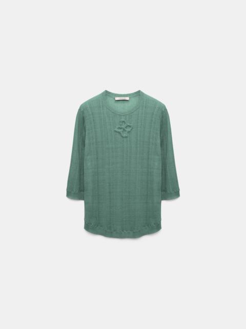 Everything is rosy. The linen blend top is ribbed and has elbow-length sleeves. The relaxed style has D-rose embroidery at the throat and crochet-like ribbed trim. Material & Care - 78 % Linen, 21 % Polyamide, 1 % Polyester - Linen-blend ribbed pullover - Round neckline with tonal D-rose relief embroidery at the front - Ribbed neckline and sleeve opening with ajour effect - Rounded hem - WE CARE - This item is finished according to STANDARD 100 by OEKO-TEX, 22.0.98928 Hohenstein HTTI - Hand wash cold / Machine wash cold - Wash with similar colors Size & Fit - Loosely fitted - Fitted shoulders - Fitted sleeves