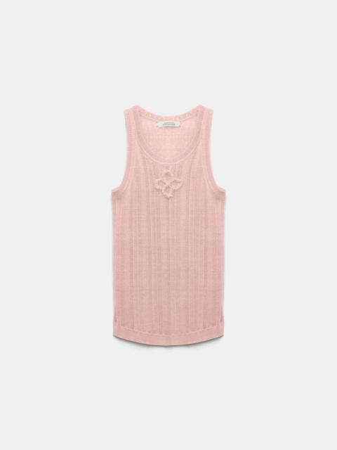 Everything is rosy. The linen blend tank top is ribbed and has a round neckline. The fitted style has D-rose embroidery at the throat and crochet-like ribbed trim. Material & Care - 78 % Linen, 21 % Polyamide, 1 % Polyester - Linen-blend ribbed tank top - Round neckline with tonal D-rose relief embroidery at the front - Ribbed neckline and sleeve opening with ajour effect - Rounded hem with small slits - WE CARE - This item is finished according to STANDARD 100 by OEKO-TEX, 22.0.98928 Hohenstein HTTI - Hand wash cold / Machine wash cold - Wash with similar colors Size & Fit - Our model is 178cm tall and wears a size S - Fitted