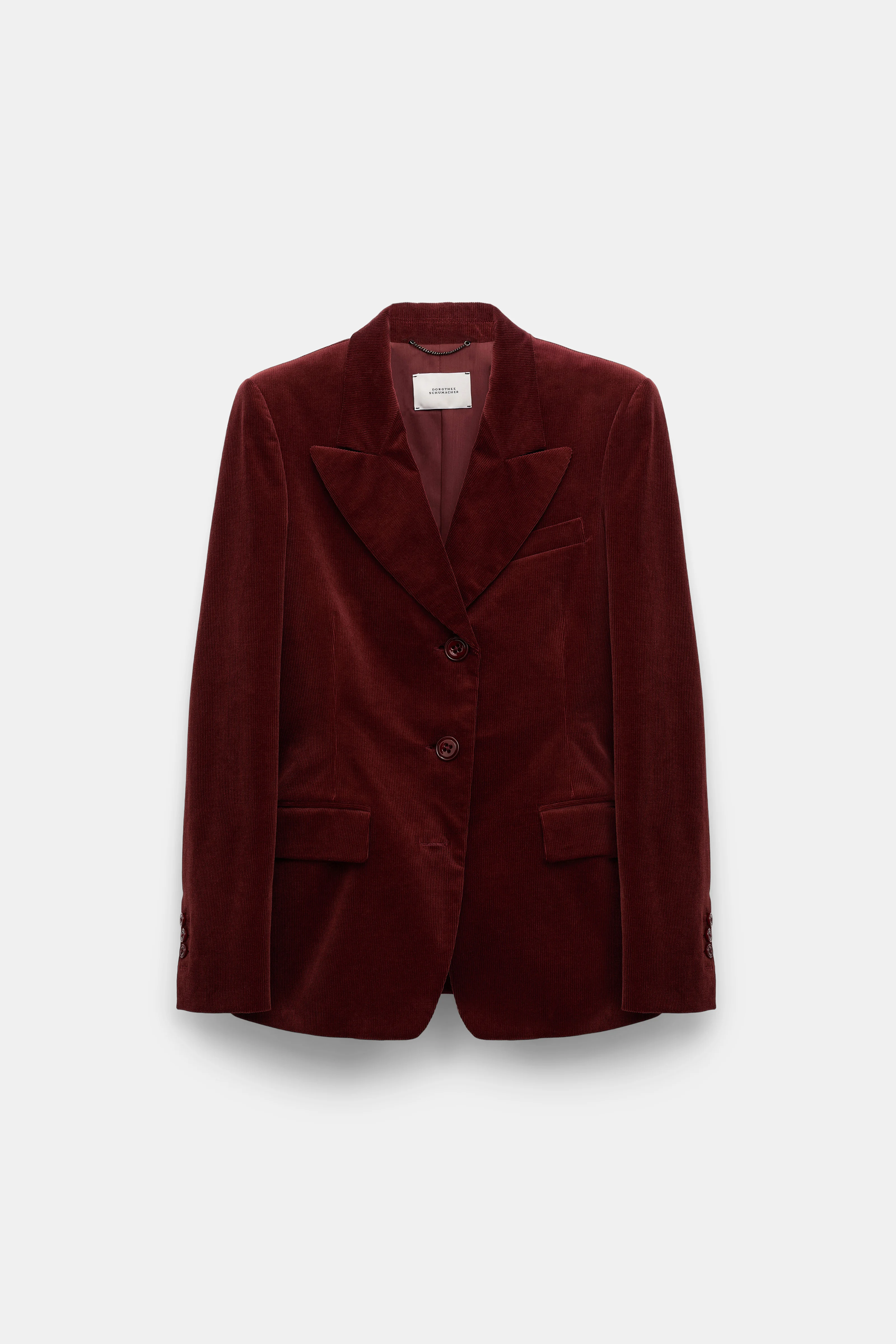 The slim tailored blazer has a peaked lapel and is detailed in a soft cotton corduroy mix. The blazer can be worn as a suit with the matching corduroy pants. Material & Care - 74 % Cotton, 24 % Modal, 2 % Elastane - Corduroy blazer - Peaked lapel - Flap pockets - Chest pocket - Slit cuffs - Fully lined - Hand wash cold / Machine wash old - Wash with similar colors Size & Fit - Our model is 179cm tall and wears a size 2 - Form-fitting