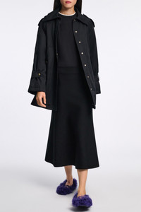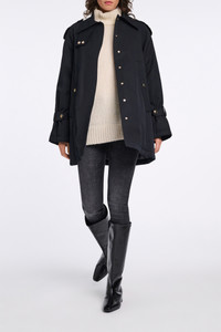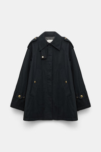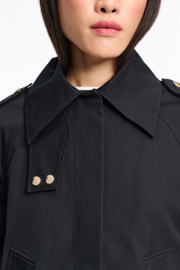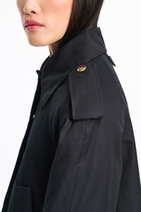 A sleek outerwear style in black cotton, the coat recalls a pared down iteration of the iconic trench. The shorter cut, A-line silhouette has gold hardware, concealed front closures and quilted lining. Material & Care - 100 % Cotton - Short cotton coat - Raglan sleeves - Welt pockets - Epaulettes - Tabbed cuffs - Gold-tone details - Quilted lining Size & Fit - A-Line