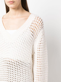 V-neck open-knit sweatshirt Highlights - Milk white - Wool-cashmere blend - Open knit - Ribbed-knit edge - V-neck - Long sleeves - Straight hem Imported Composition Wool 80%, Cashmere 20% SIZE & FIT Model measurements Height 5 ft 11 in(1.8 m) Bust/Chest 31.49 in(80 cm) Hips 36.22 in(92 cm) Waist 25.59 in(65 cm) FittingInformation Designed to be unstructured, offering a loose fit throughout Made with a midweight knit, this piece offers some stretch This piece fits true to size – take your usual size