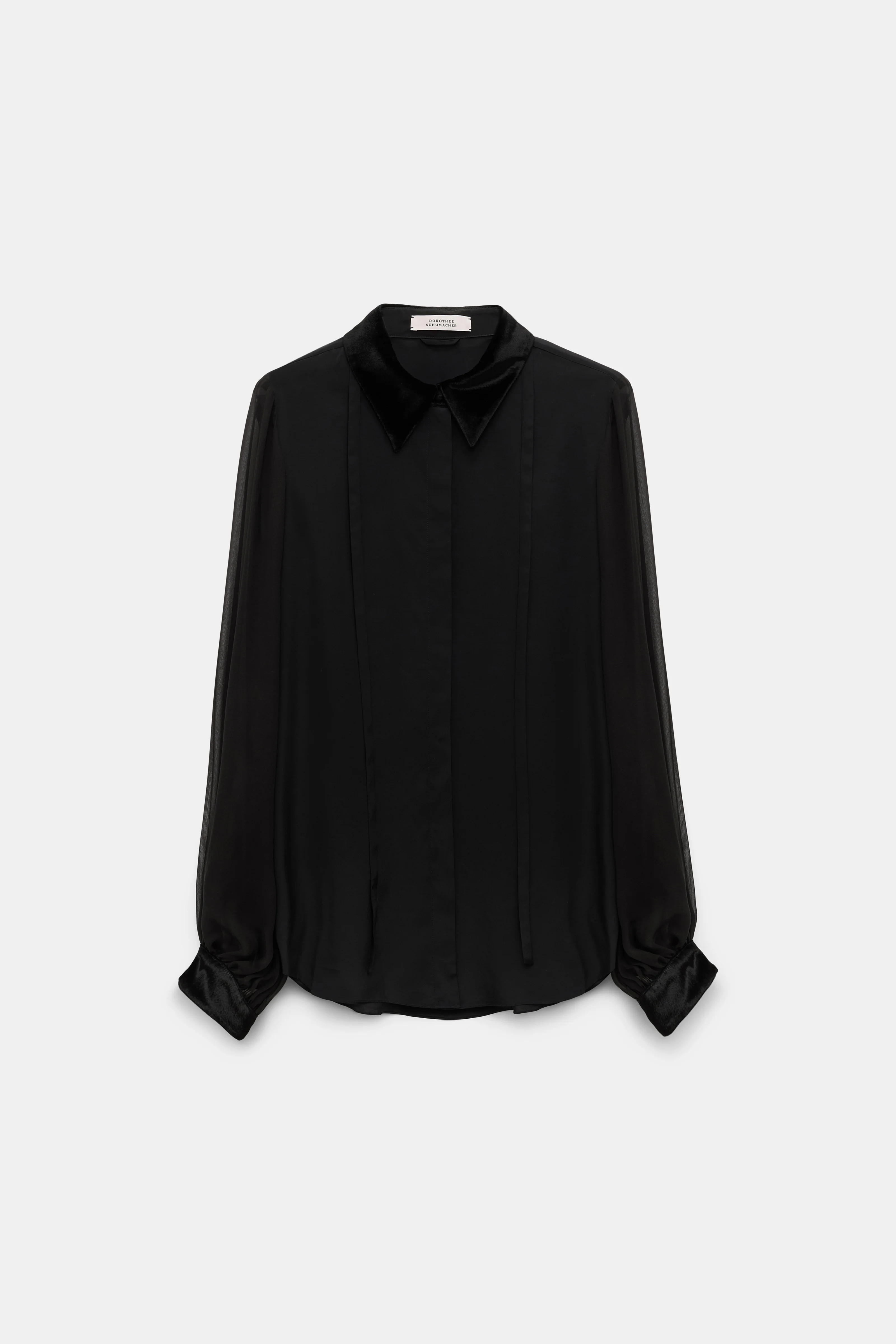 The blouse is styled in a peek-a-boo tonal material mix, and has a glossy velvet collar. The blouse can be worn as a set with the matching bias-cut skirt. Material & Care - 70 % Viscose, 30 % Silk - Material mix blouse - Body in flowing silk-viscose crepe de Chine - Sleeves in transparent silk georgette - Collar and cuffs in glossy velvet - Removable ribbon tie - Hand wash cold / Machine wash old - Wash with similar colors Size & Fit - Our model is 180cm tall and wears a size 2 - Fitted shoulders - Relaxed fit - Voluminous sleeves