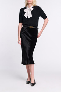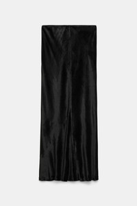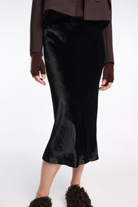 The bias-cut midi-skirt is styled in glossy velvet and has an elastic waist. The skirt can be worn as a set with the matching velvet collar blouse. Material & Care - 85 % Viscose, 15 % Silk - Bias-cut midi-skirt in glossy velvet - Elastic waist - Hand wash cold / Machine wash old - Wash with similar colors Size & Fit - Our model is 178cm tall and wears a size 2 - Form-fitting silhouette
